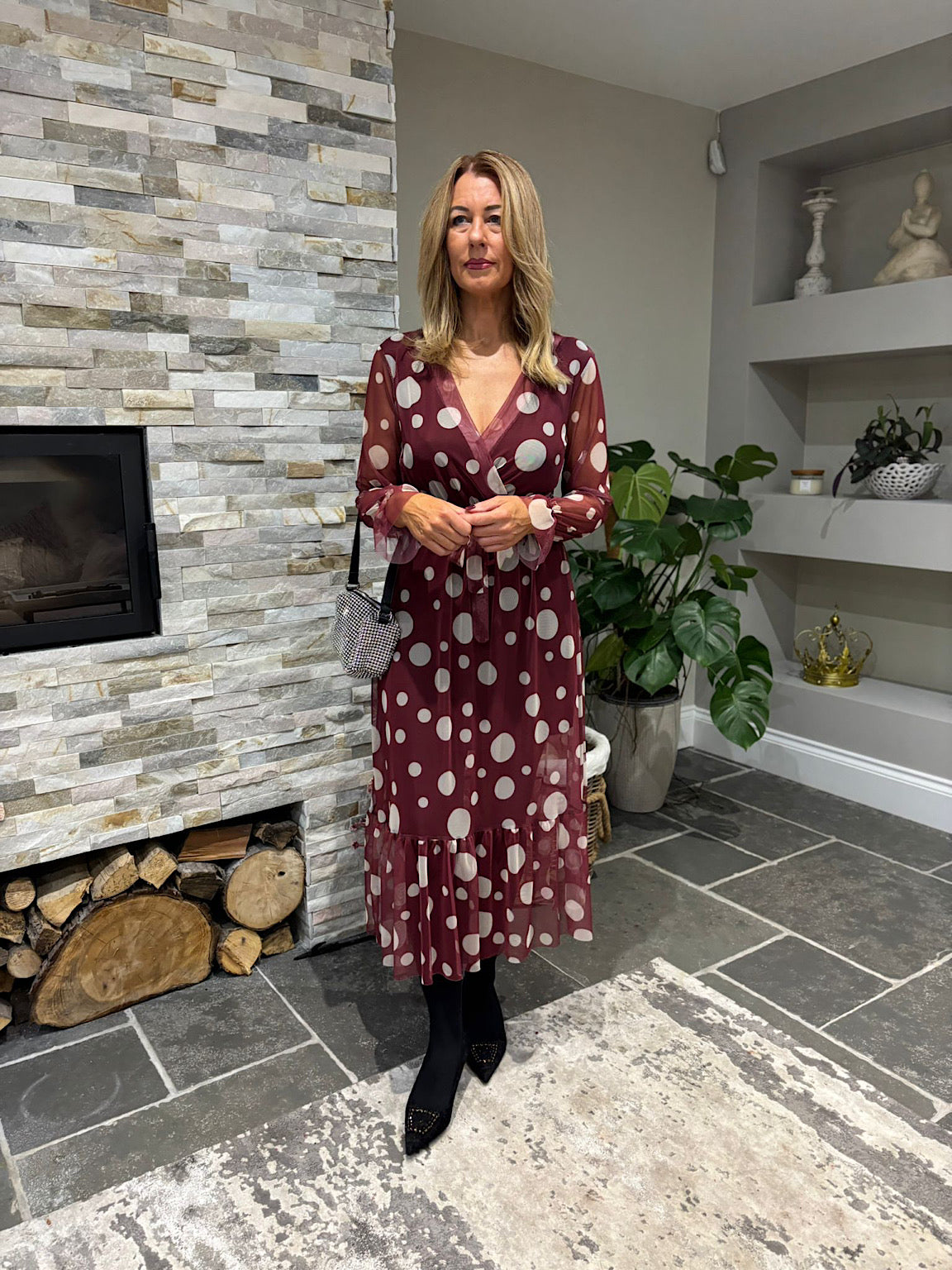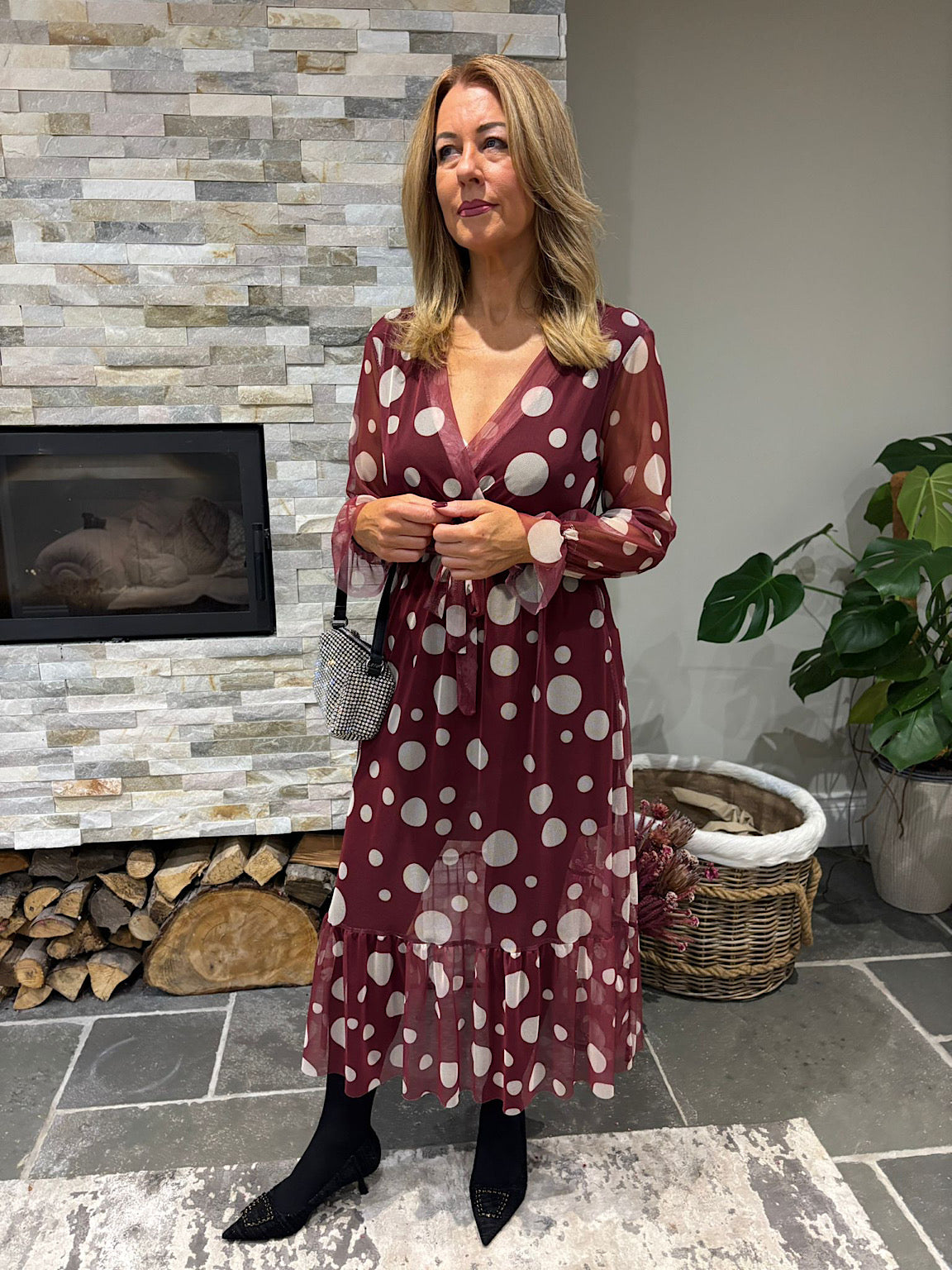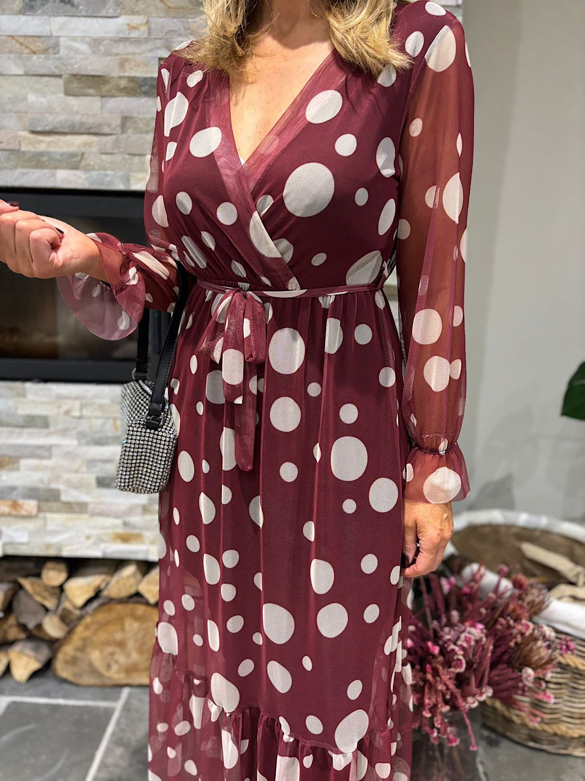Wine Polka Dot Belted Mesh Dress Alana