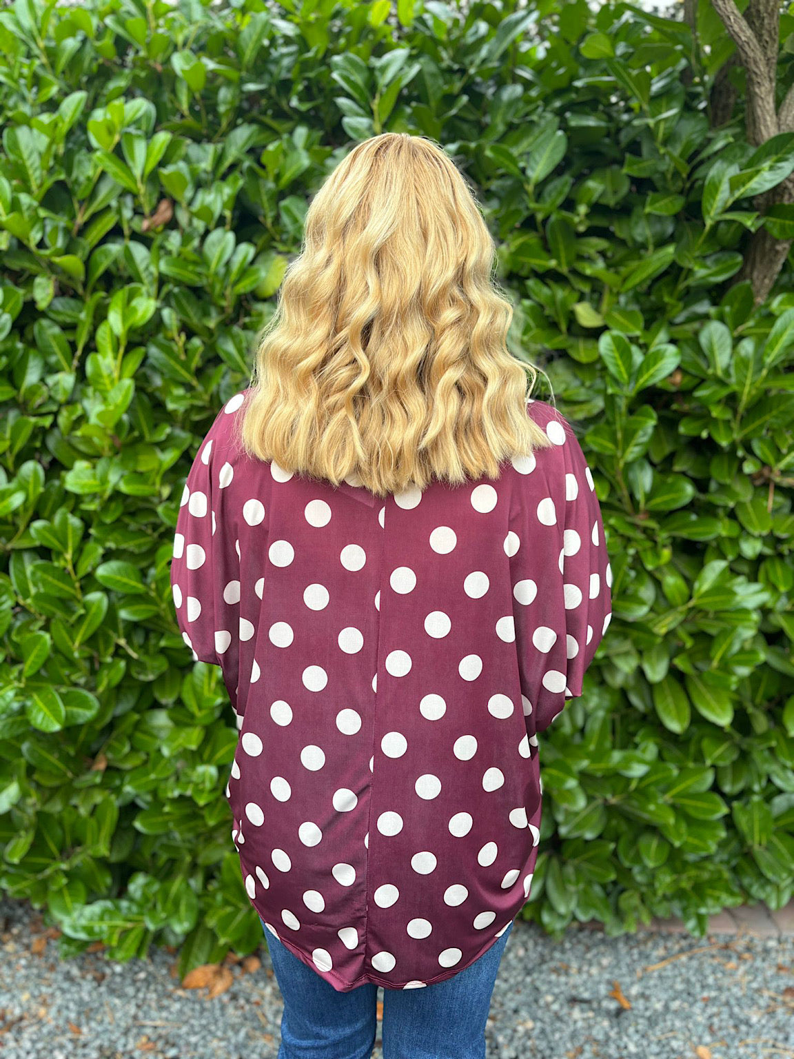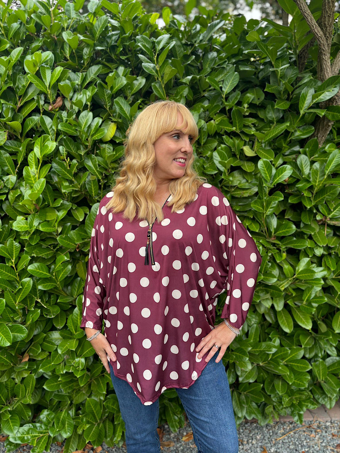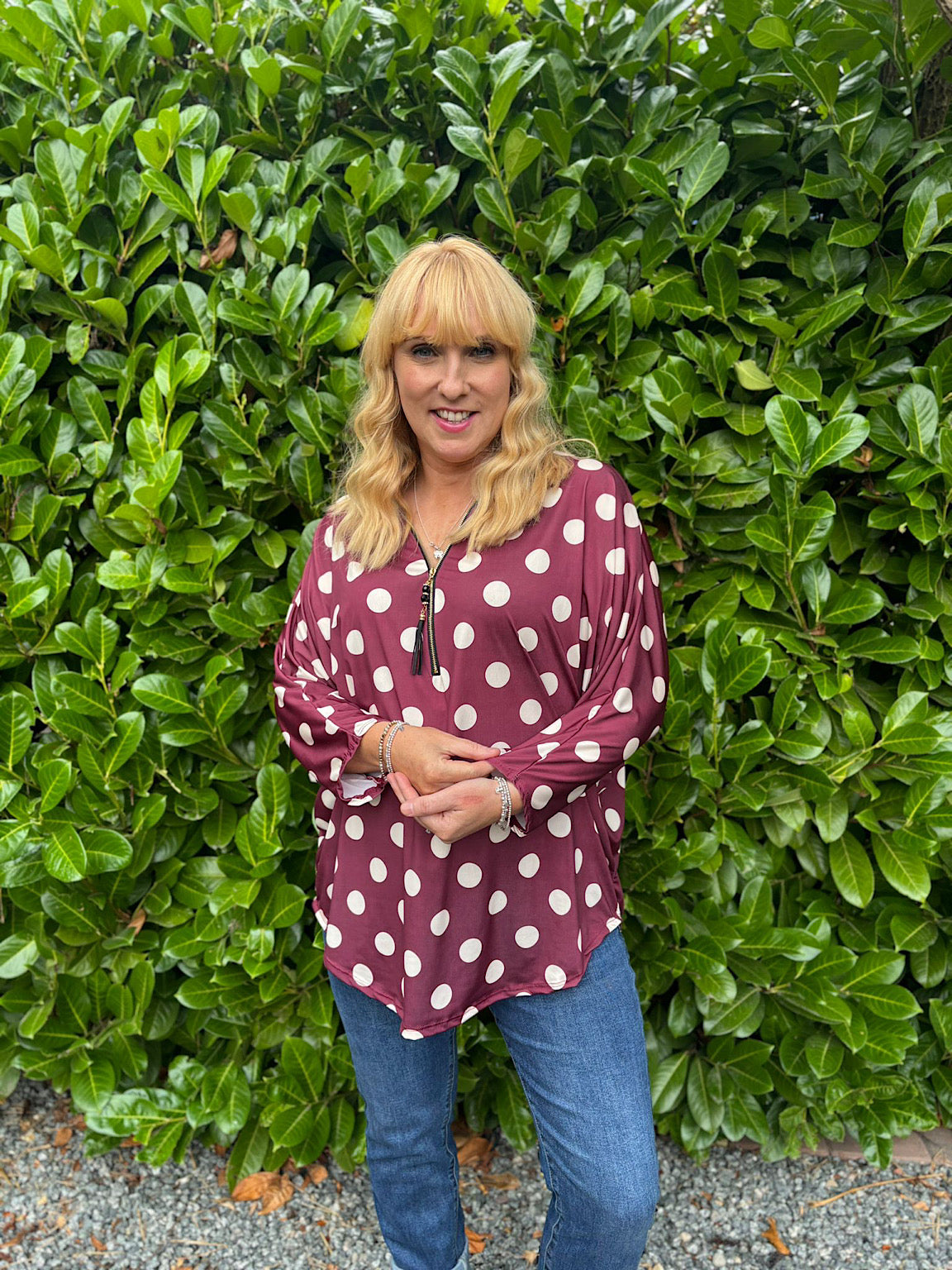 This Polka Dot Zip Top Poppy features elegant batwing sleeves that offer a flattering silhouette and comfortable fit. Crafted from smooth, flowing material, it drapes beautifully on the body. The zip closure is adorned with a stylish tassel detail, adding a subtle touch of charm to this versatile and supportive top. Perfect for adding sophistication and ease to your wardrobe.
