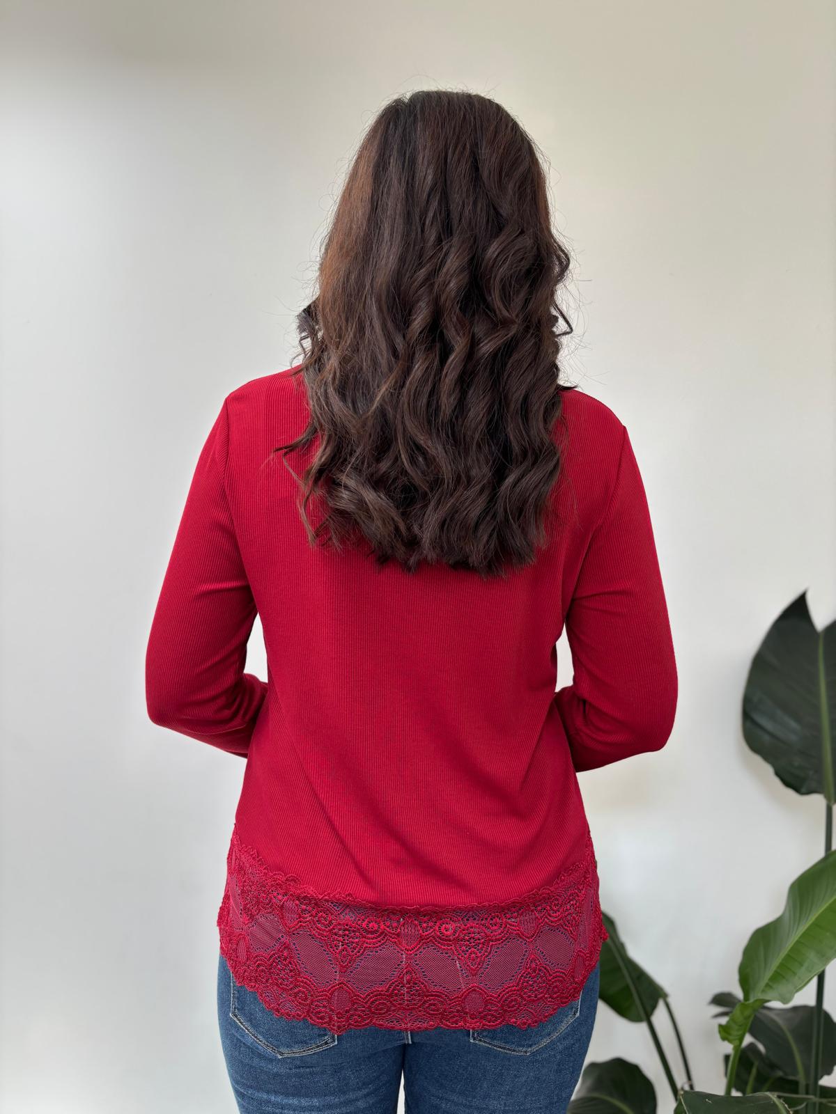 Introducing the Ribbed Lace Trim Top Madeline. This elegant yet simple top features a lightweight and ribbed design, accentuated with delicate lace trim. Perfect for adding a touch of sophistication to any outfit.