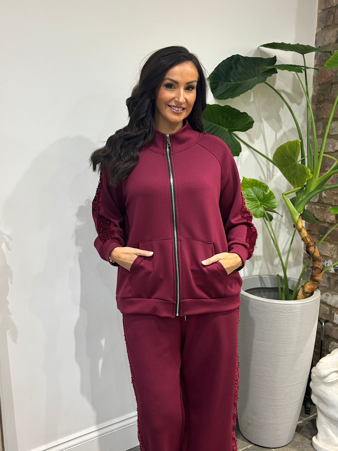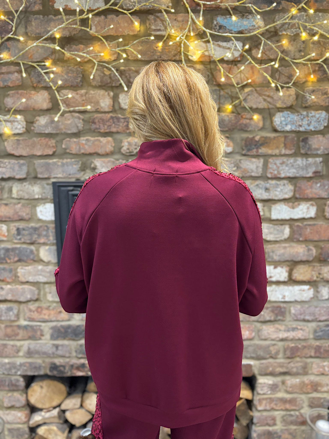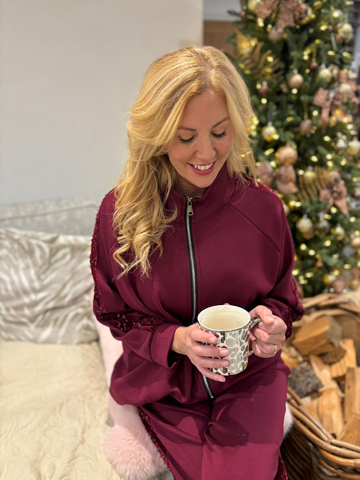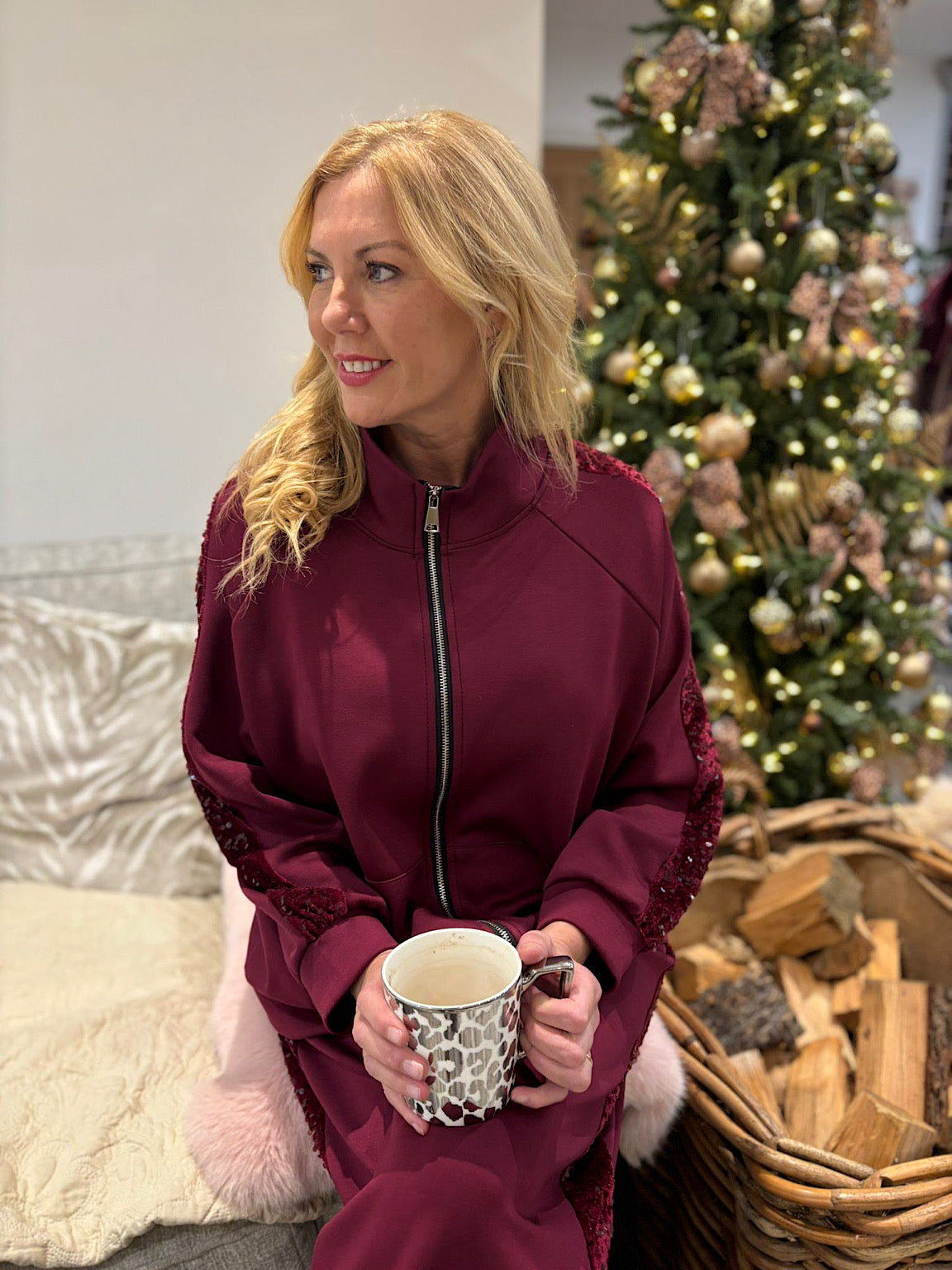 Indulge in the luxurious softness of this Sequin Velour Trim Jacket, inspired by our beloved Esme collection. Featuring a chic high neck and smooth zip fastening, it showcases eye-catching velour sequin panels running down the arms for added glamour. The perfect companion to our Trixie joggers, this jacket effortlessly elevates any casual ensemble with its sophisticated blend of comfort and style.