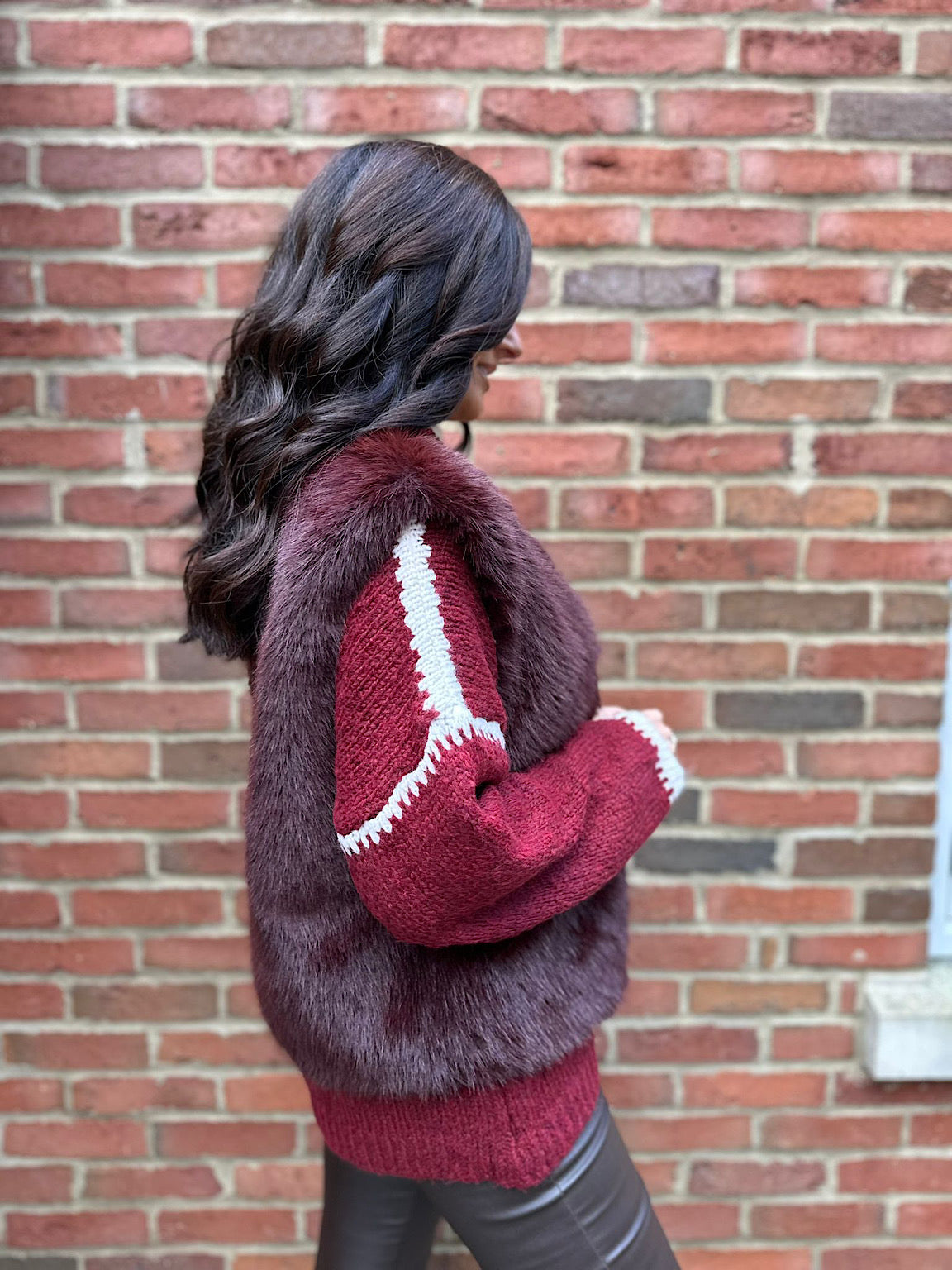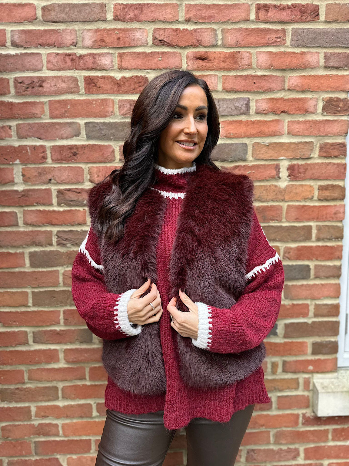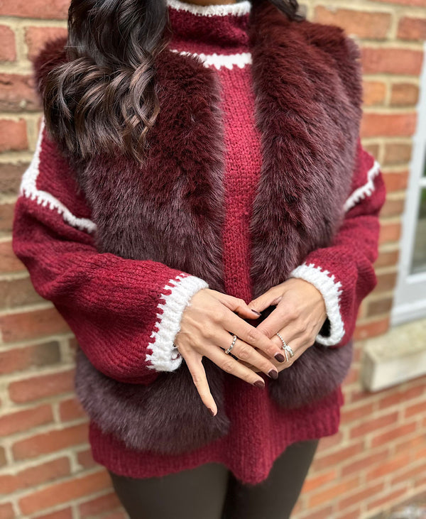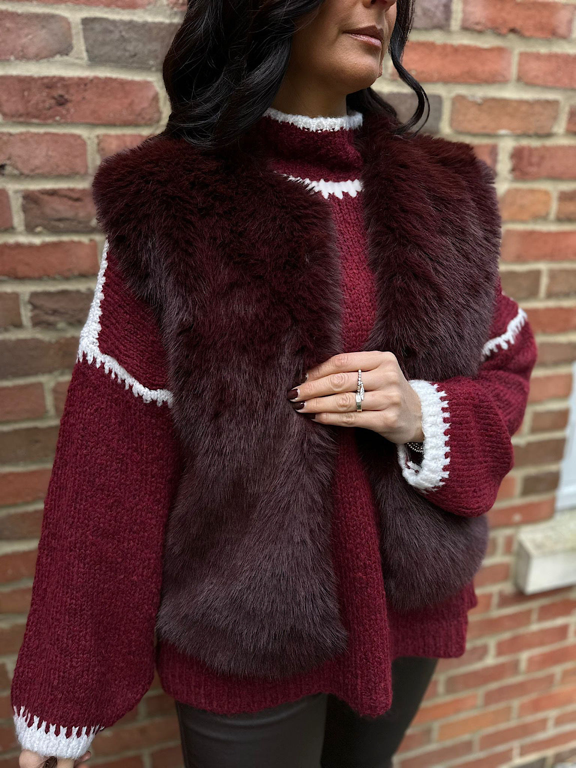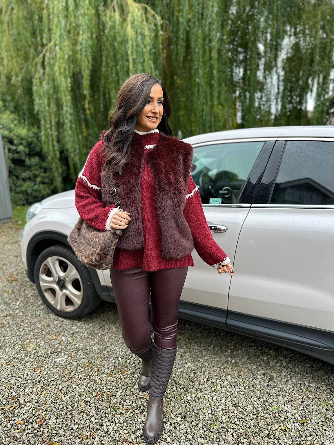 Styled with.....>Wine Blanket Stitch Premium Knit Jemima/ Chocolate Quilted Knee High Boots/ Wine Coated Trousers
