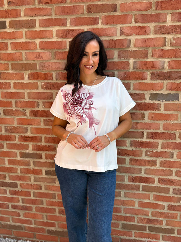 This Single Embroidered Floral Tee Jill combines comfortable, high-quality t-shirt fabric with a delicate embroidered flower accent featuring shimmering coloured sequins. It's designed to offer both style and lasting wear, making it an ideal addition to your casual wardrobe.