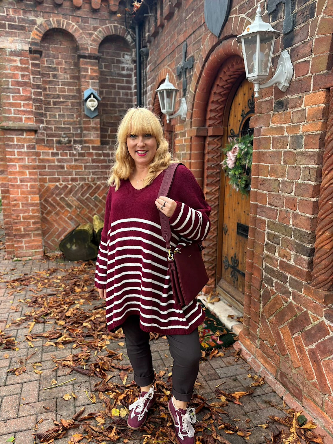 The Stripe Knitted Jumper Anne features an oversized relaxed fit for ultimate comfort, paired with a timeless classic stripe pattern that adds subtle style. Its flattering V-neck design enhances versatility, making it perfect for layering or wearing on its own. This jumper offers both cosy warmth and effortless fashion, supporting your everyday wardrobe needs.