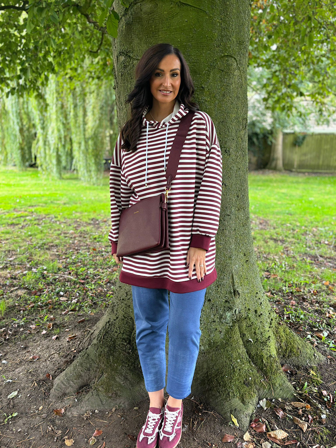 Styled with.....>Wine Harper Lace Detail Trainer/ Wine Multi Compartment Crossbody Bag/ Denim Look Trousers Isla