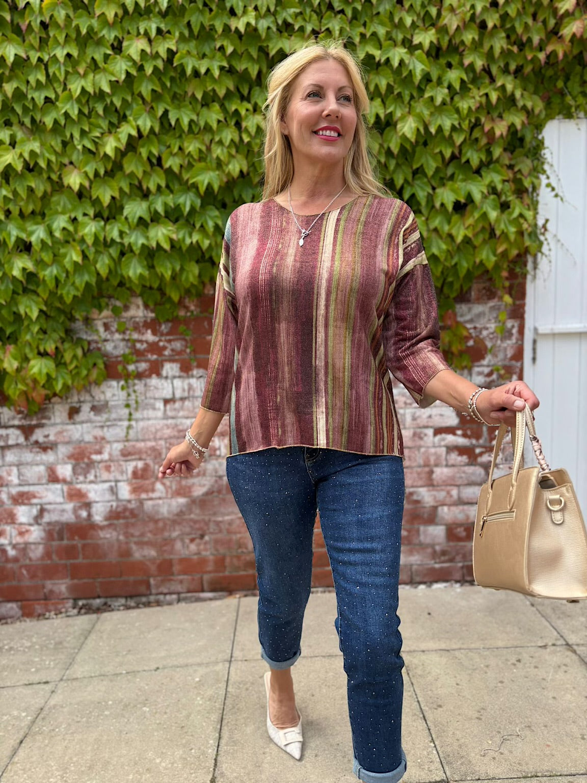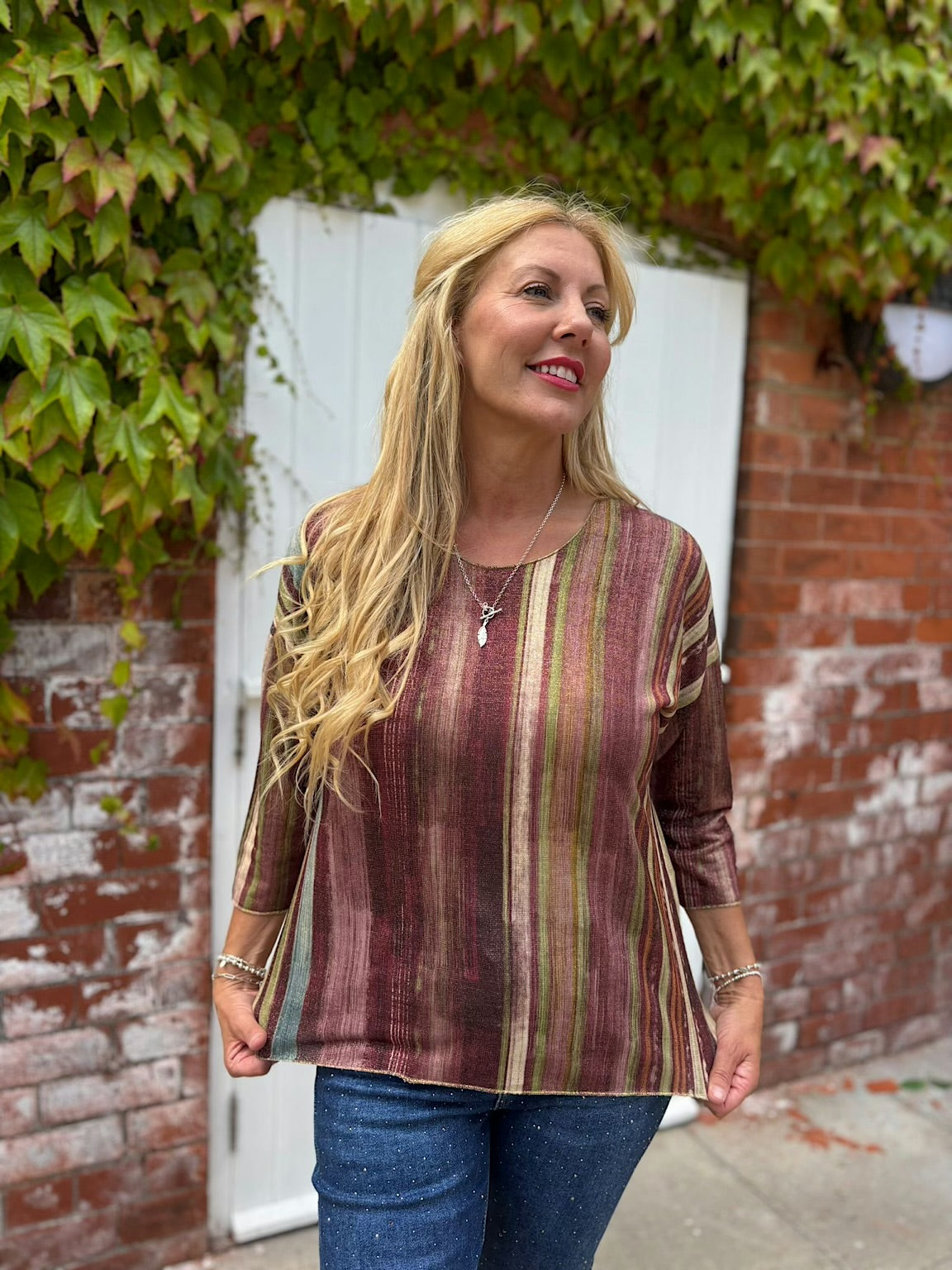 This 3/4 sleeve Striped Shimmer Top offers a subtle shine with its elegant shimmer stripes, adding a touch of sophistication to your everyday look. The comfortable fit and flattering sleeve length make it perfect for layering or wearing on its own, helping you feel confident and stylish throughout your day.