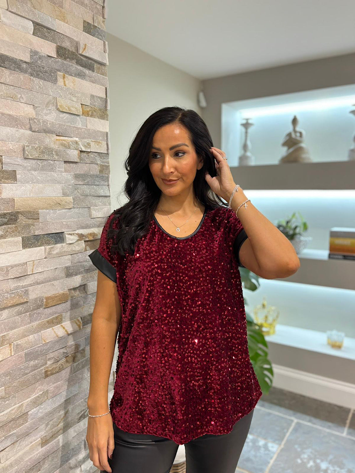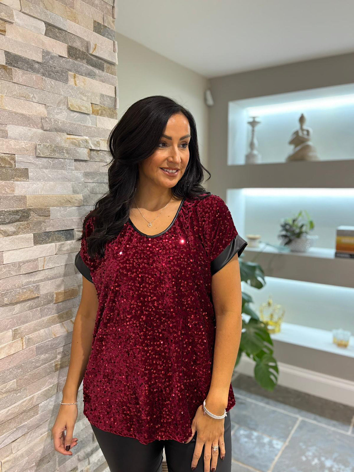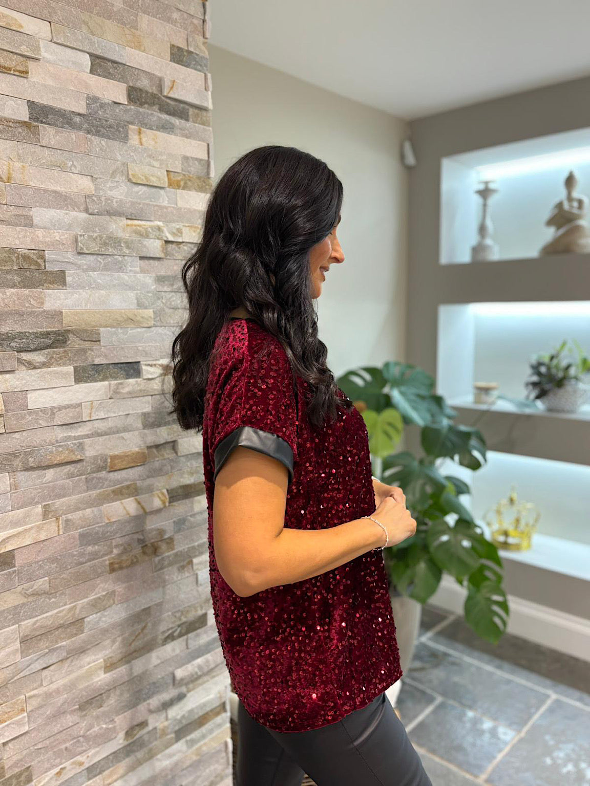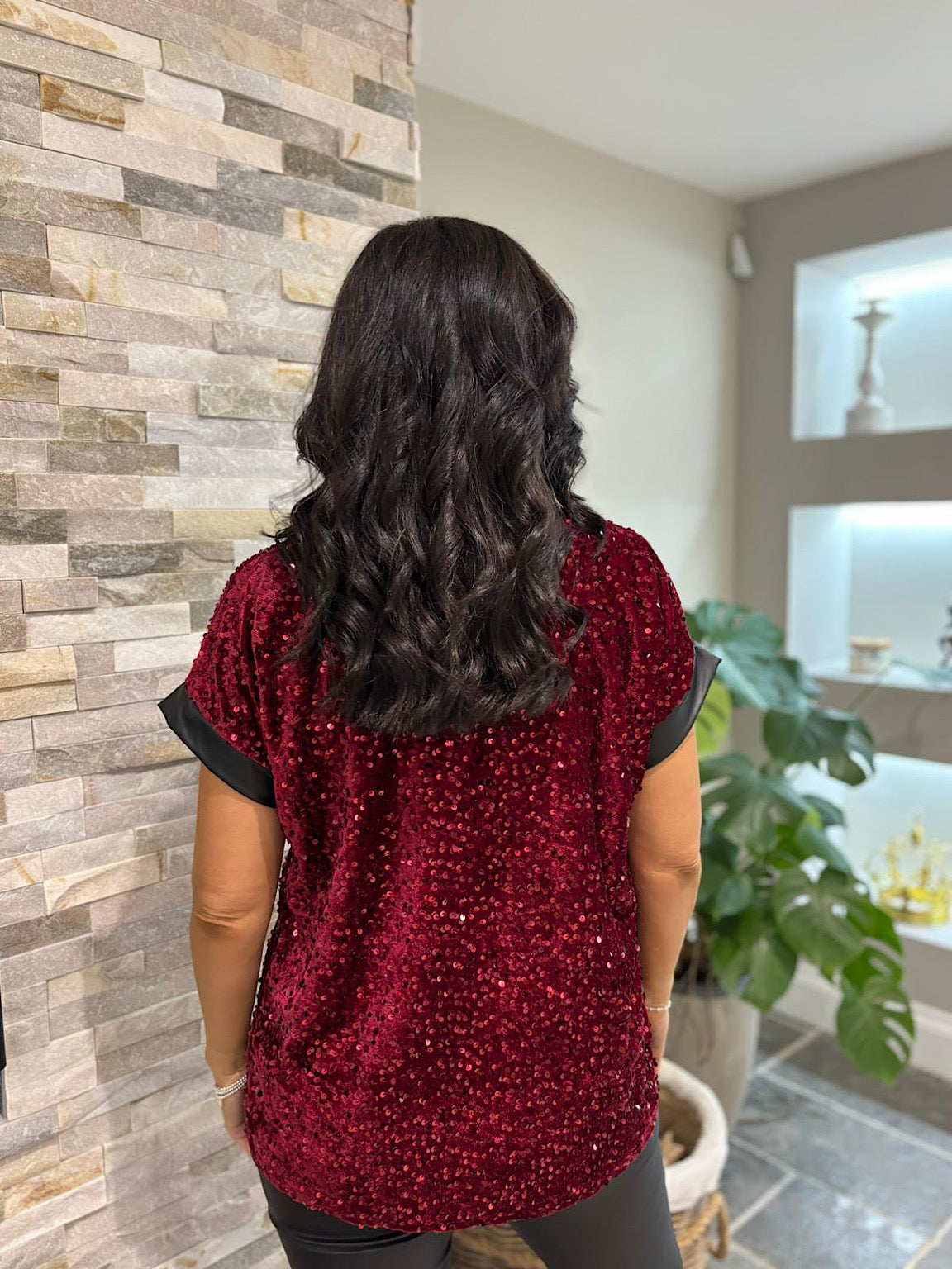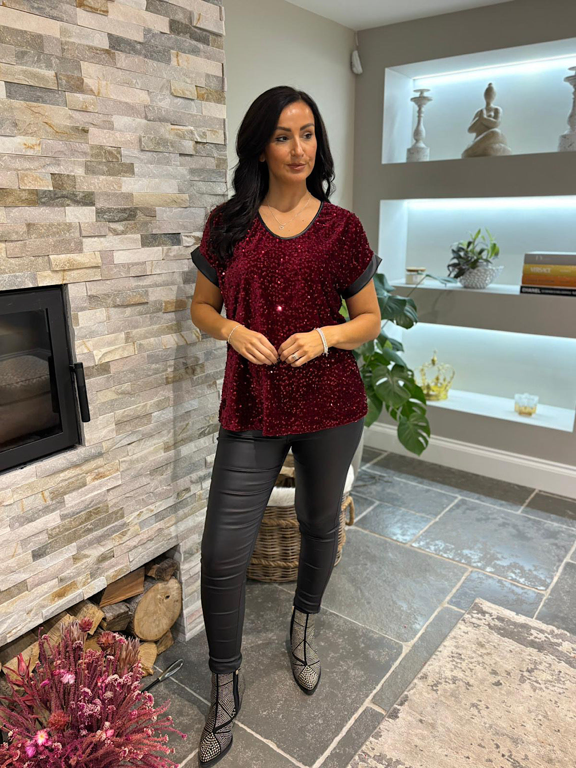 Elevate your style with the Velour Sequin Trim Top Gabby, featuring a soft velour fabric adorned with shimmering sequins. The black coated trim adds a refined, luxury finish, making it perfect for both special occasions and chic everyday wear. Comfortable yet striking, this top enhances your look effortlessly while providing a flattering fit you can feel confident in.