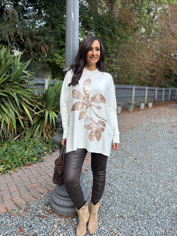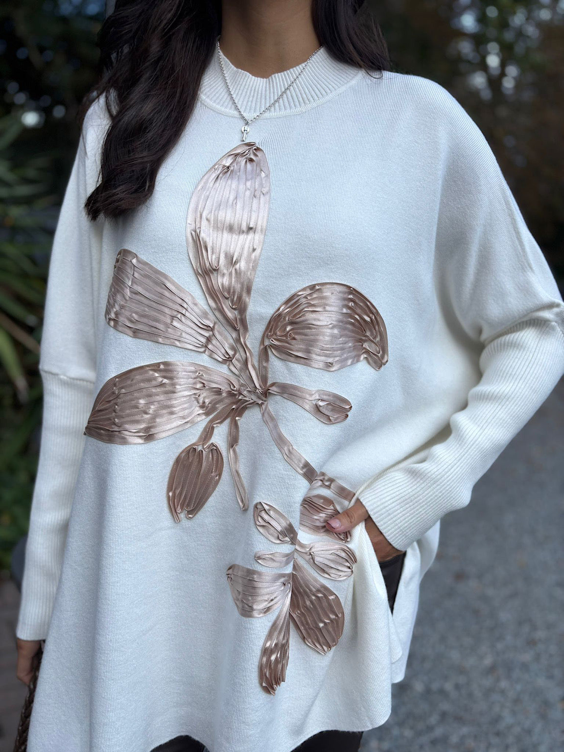 Elevate your wardrobe with the Applique Flower Knit Ella, featuring a refined crew neck and elegantly long tube sleeves. Crafted from a luxurious knit, this piece is delicately embellished with an applique flower, offering a subtle yet sophisticated statement.