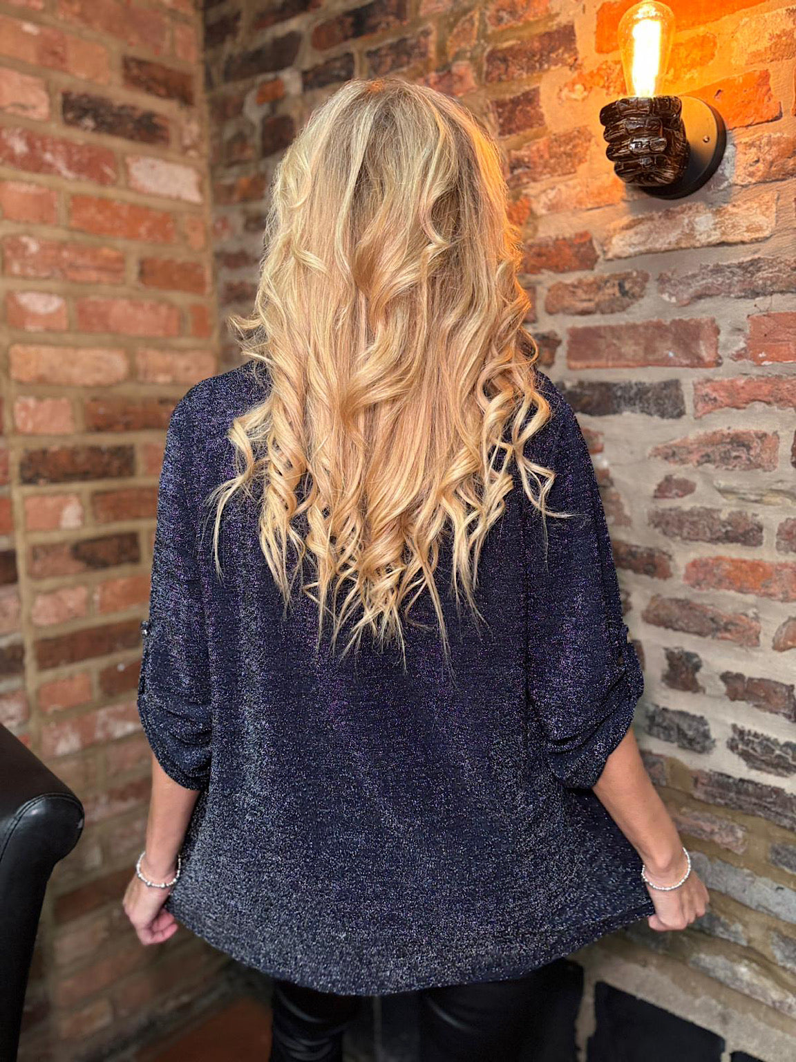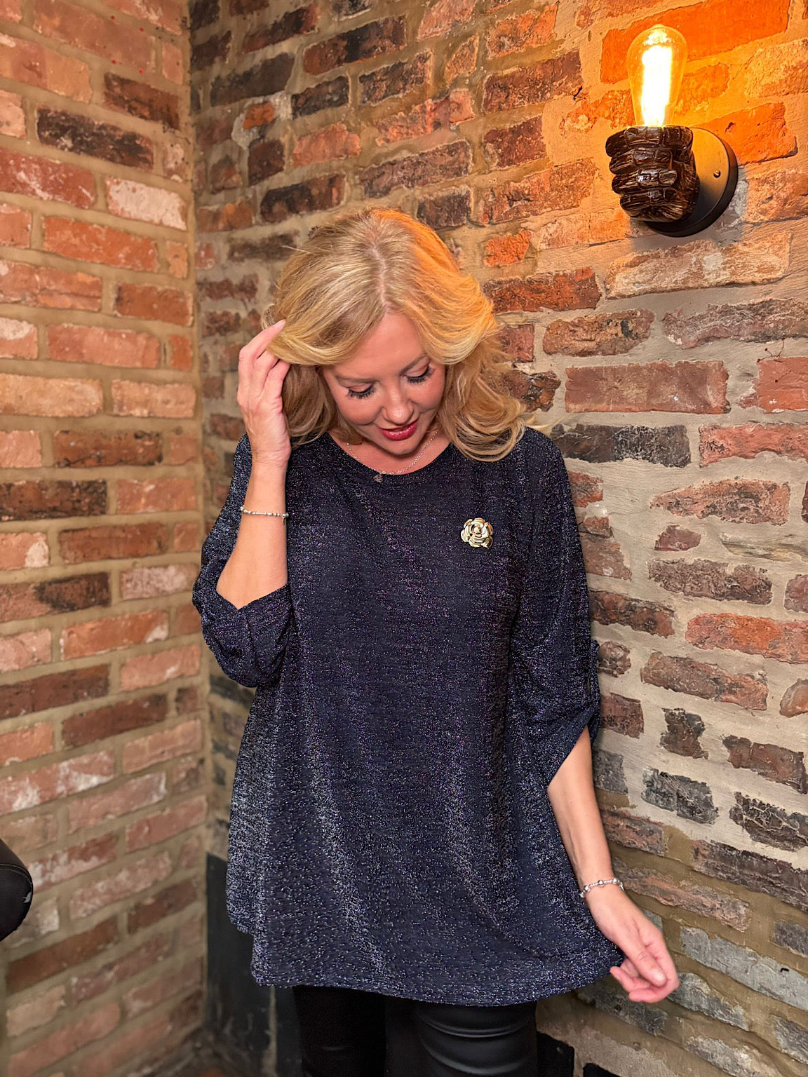 Elevate your winter wardrobe with this stunning shimmer top, crafted with lurex thread woven throughout the fabric for an eye-catching sparkle. The button sleeve detail adds a touch of sophistication, while the removeable gold brooch lets you personalise your look for any occasion. Perfect for adding glamour to your everyday style or dressing up for special moments.