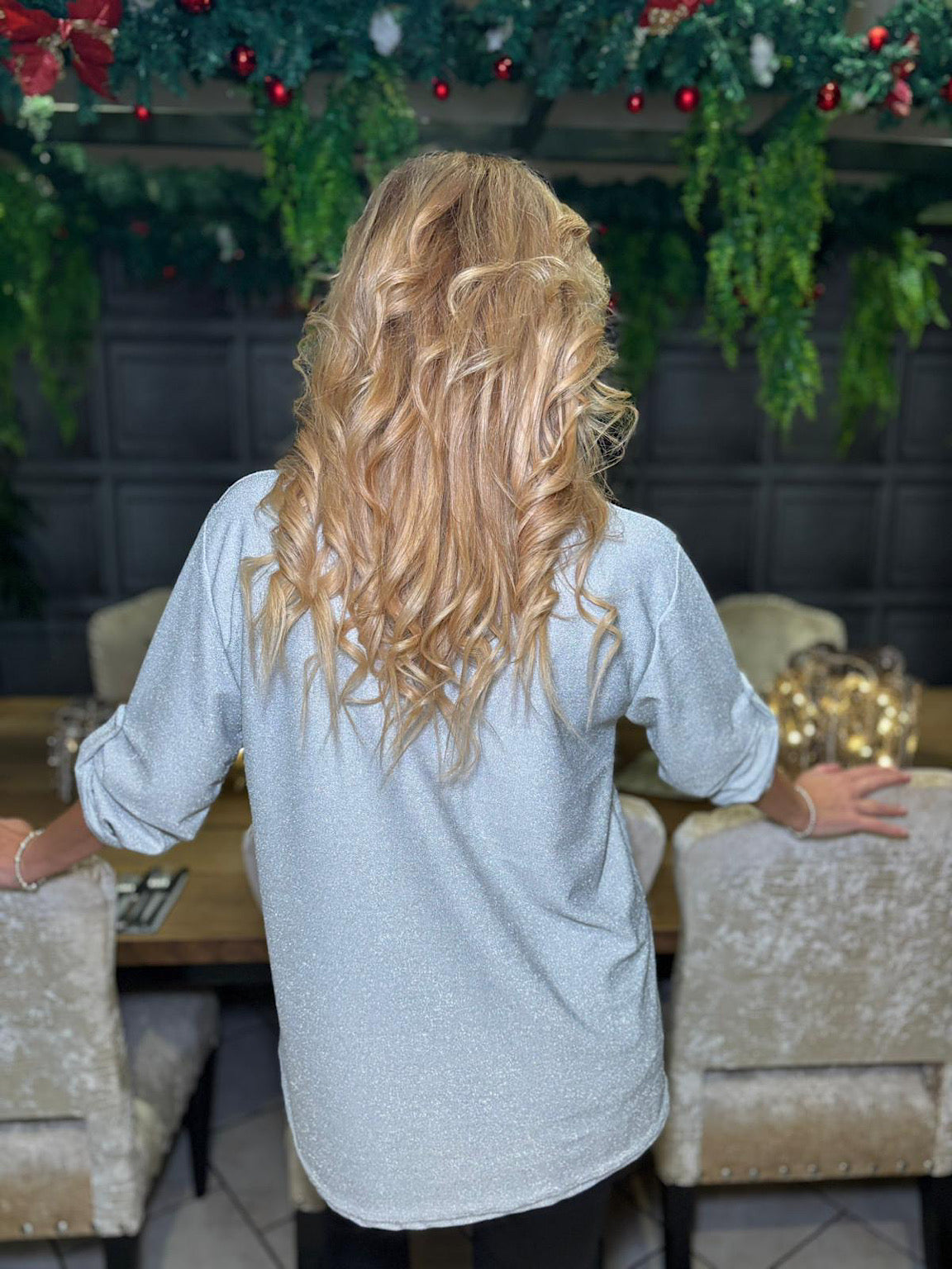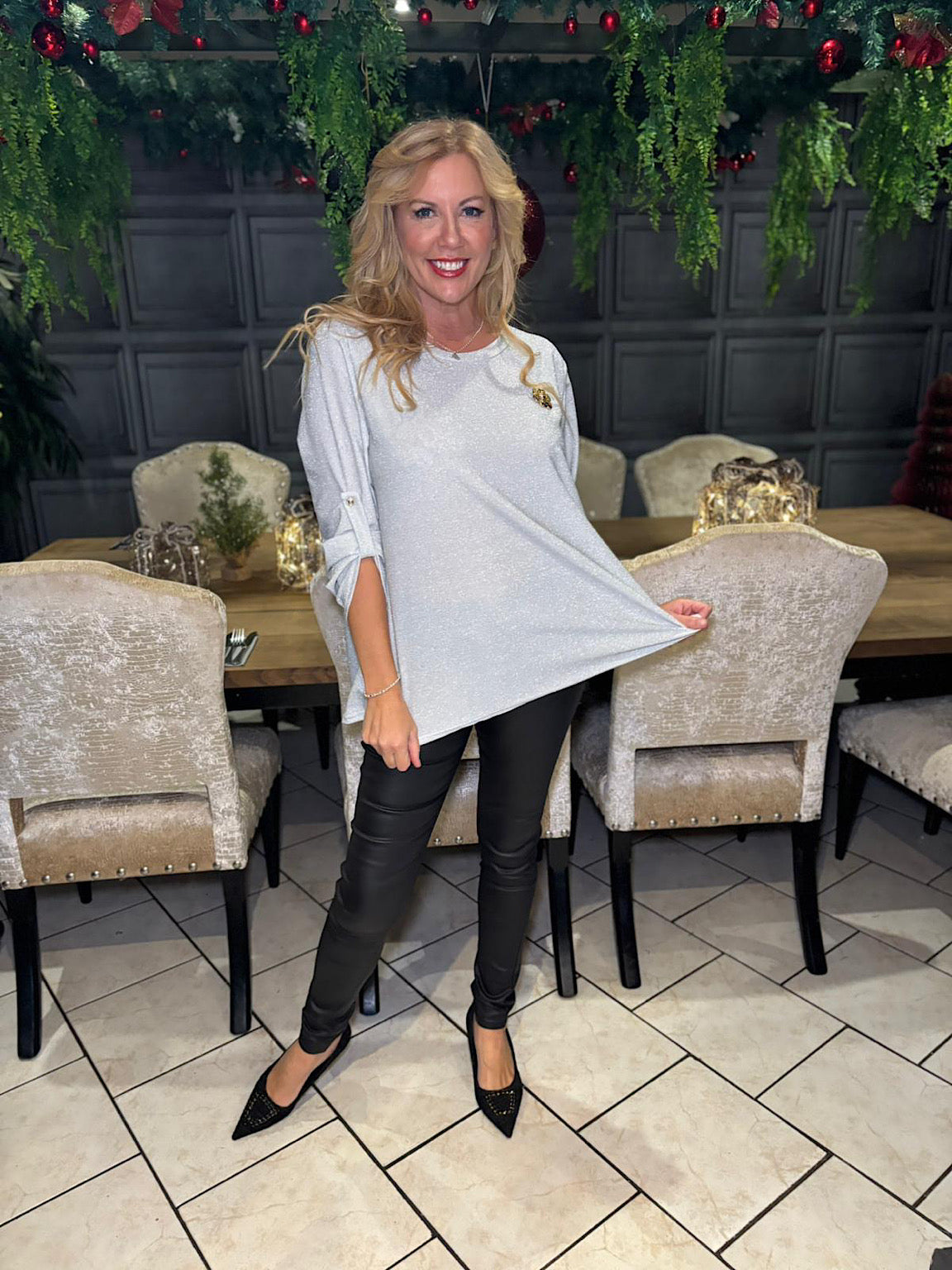 Elevate your winter wardrobe with this stunning shimmer top, crafted with lurex thread woven throughout the fabric for an eye-catching sparkle. The button sleeve detail adds a touch of sophistication, while the removeable gold brooch lets you personalise your look for any occasion. Perfect for adding glamour to your everyday style or dressing up for special moments.