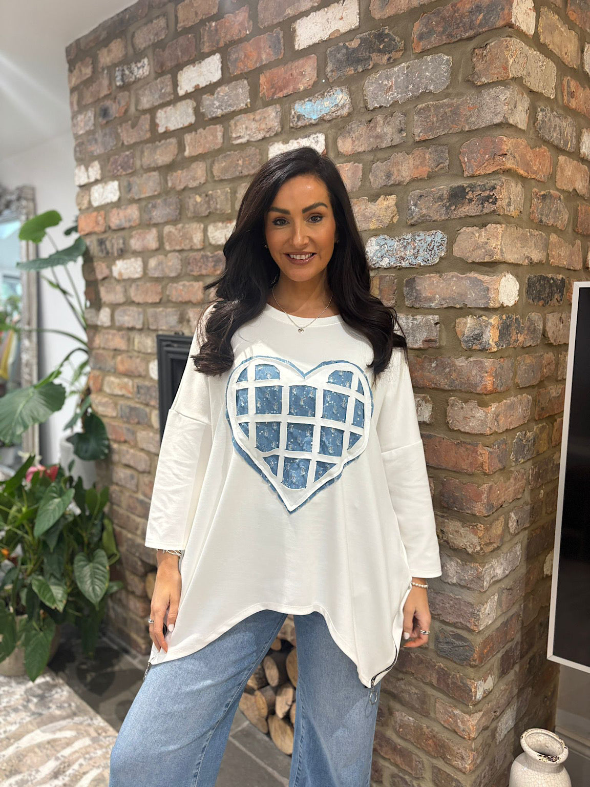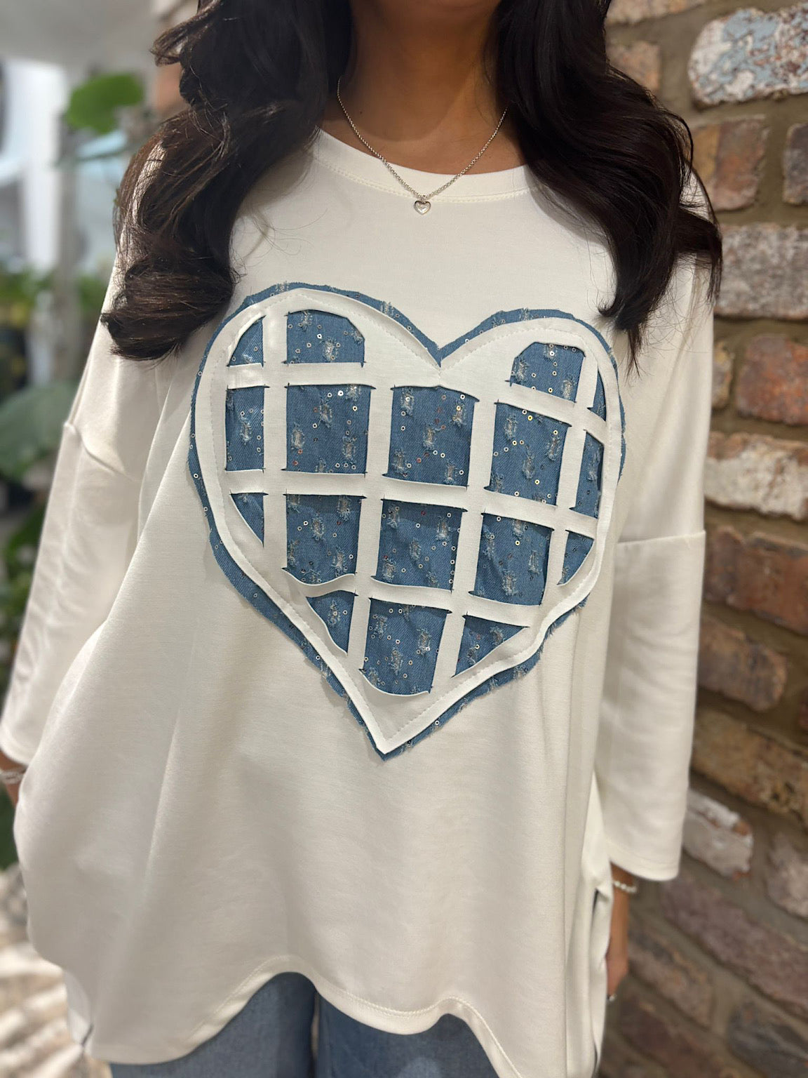 Distressed Heart Sweat Top Lynn combines edgy style with comfortable everyday wear. The standout distressed denim heart sits prominently on the front, creating visual interest and character. Practical side zips add versatility, allowing you to adjust the fit or layer effortlessly throughout the day. The layered design enhances depth and dimension, making this piece a go-to for casual outings or relaxed weekends. Perfect for those who appreciate unique details and functional fashion.