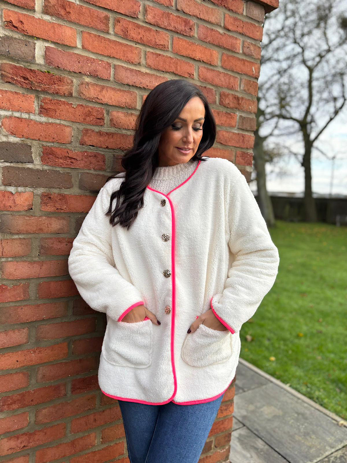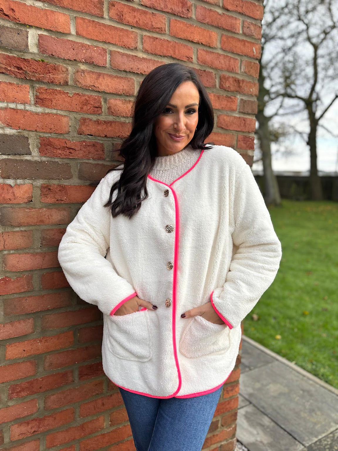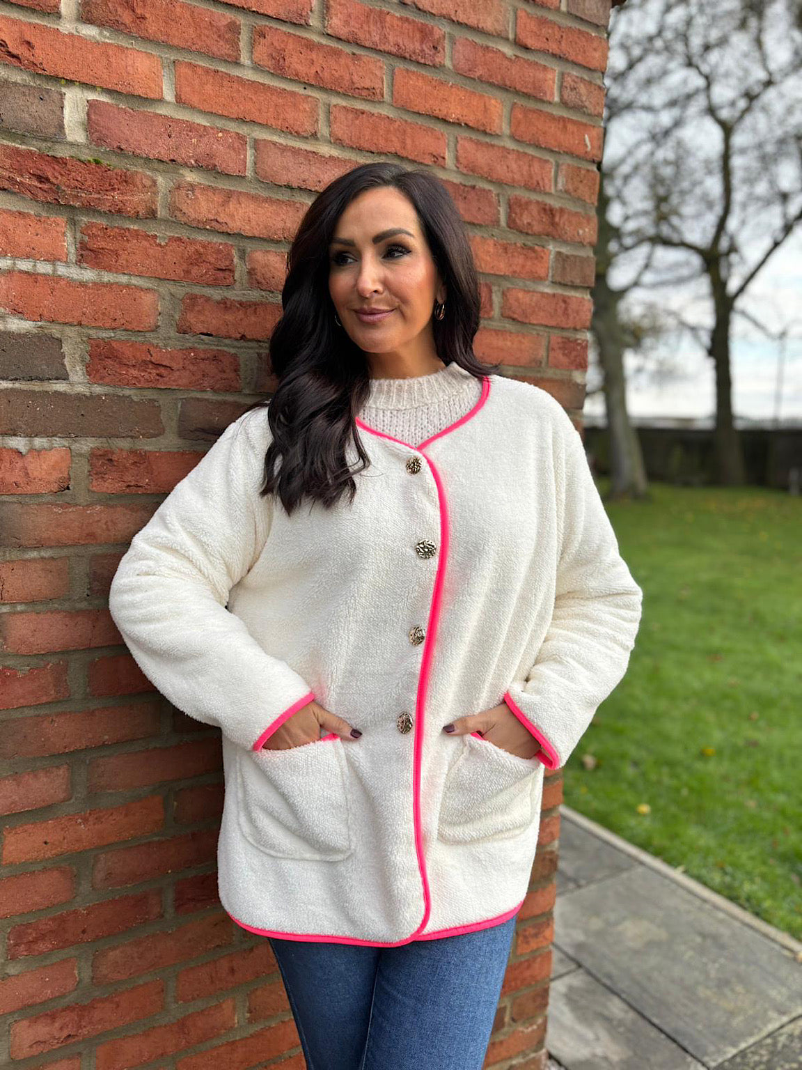 This jacket Farah is perfect for colder days. Made from soft teddy fabric and lined with a chenille fabric, it offers both comfort and warmth. The bright colour trim adds a pop of colour, while the hammered button fastening and pockets provide practicality. Stay cosy and stylish with this versatile jacket.