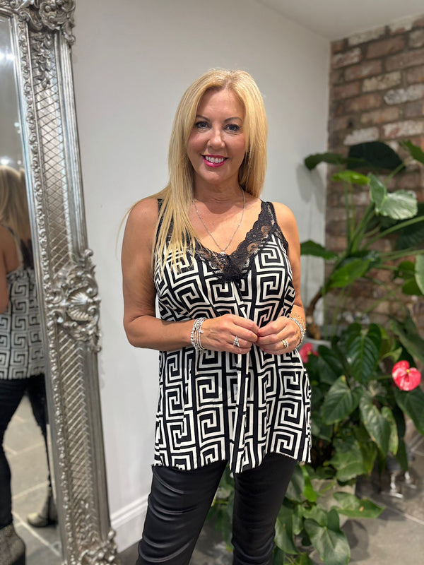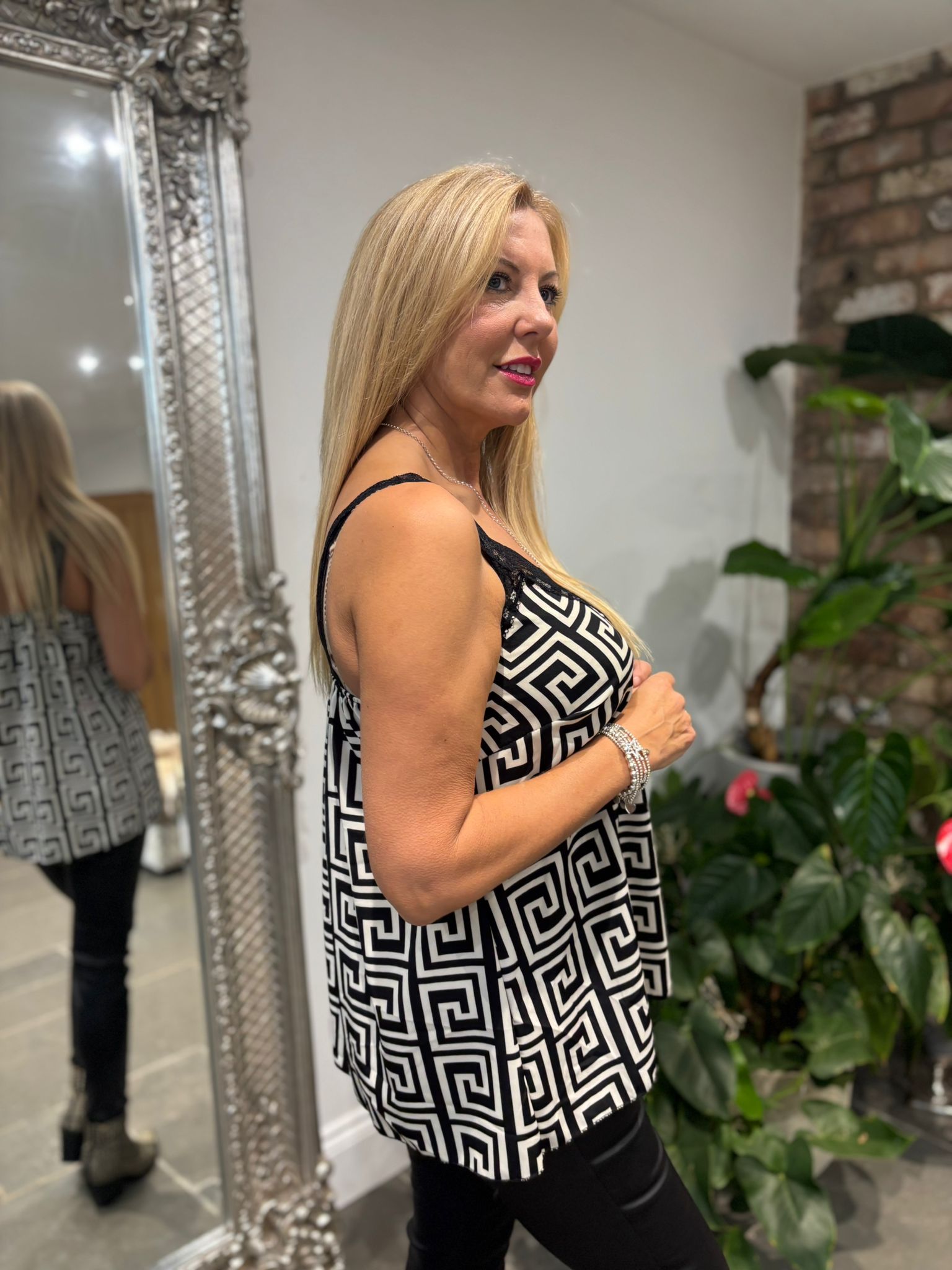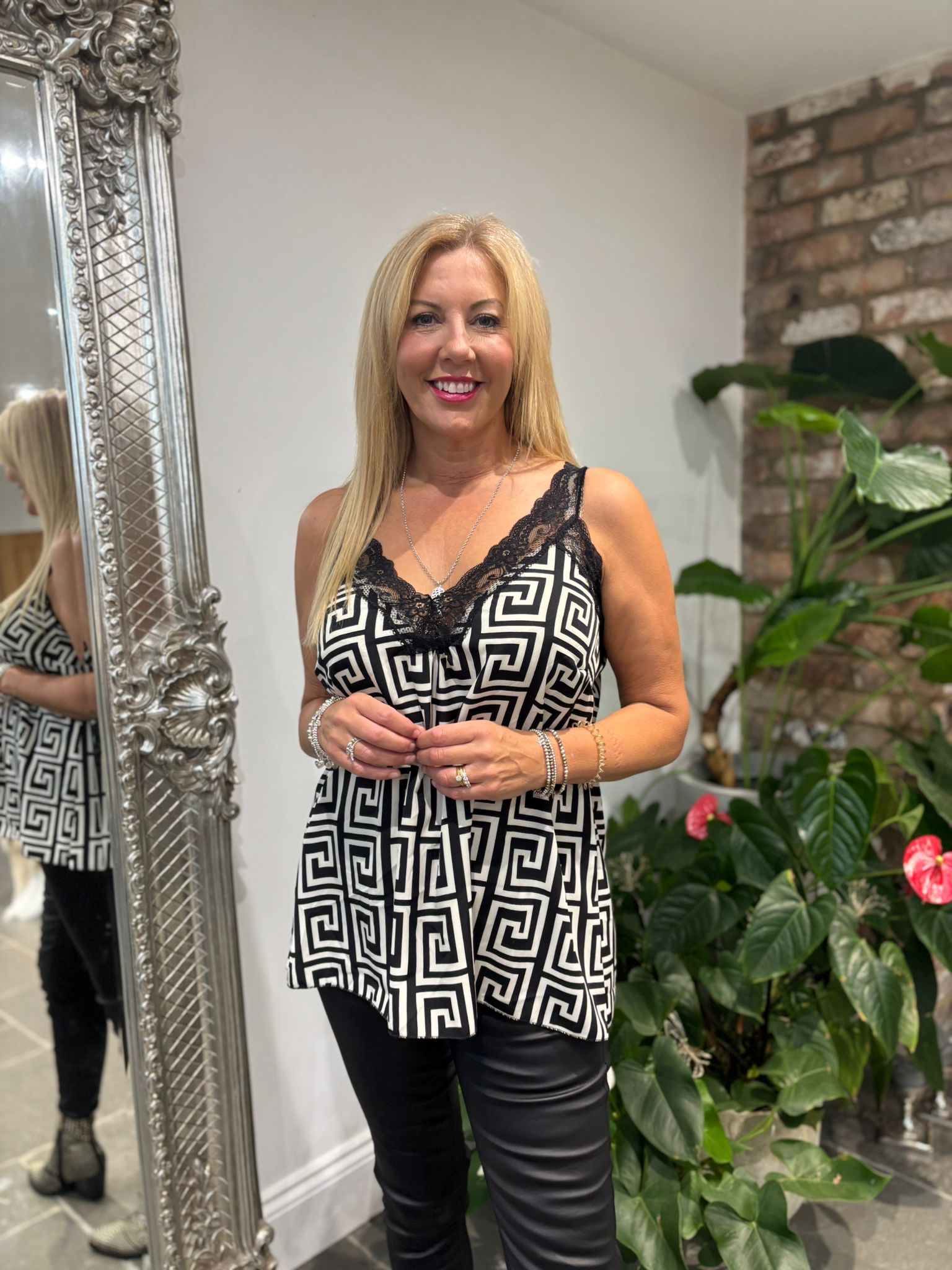 This Lace Trim Vest Megan features delicate lace detailing along the neckline and straps, adding a touch of elegance to your outfit. With an elasticated back, it ensures a comfortable and flexible fit throughout the day. Perfect for layering or wearing alone, this vest combines style and ease for everyday wear.