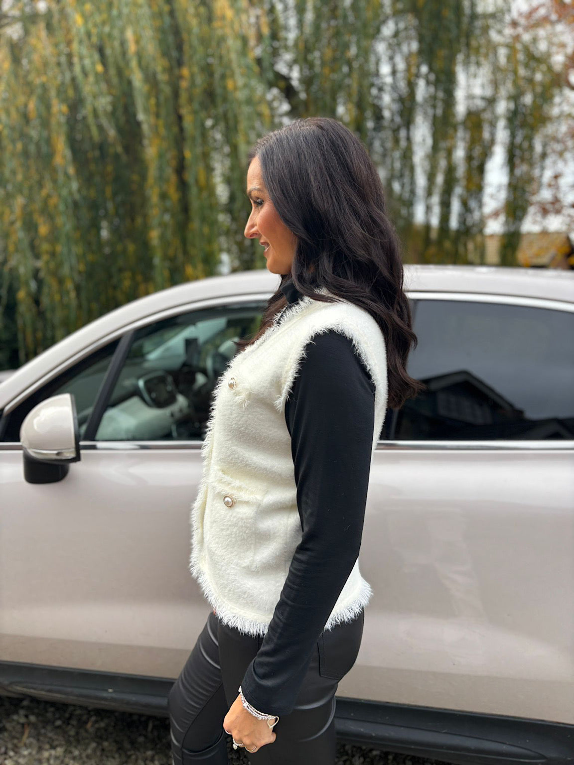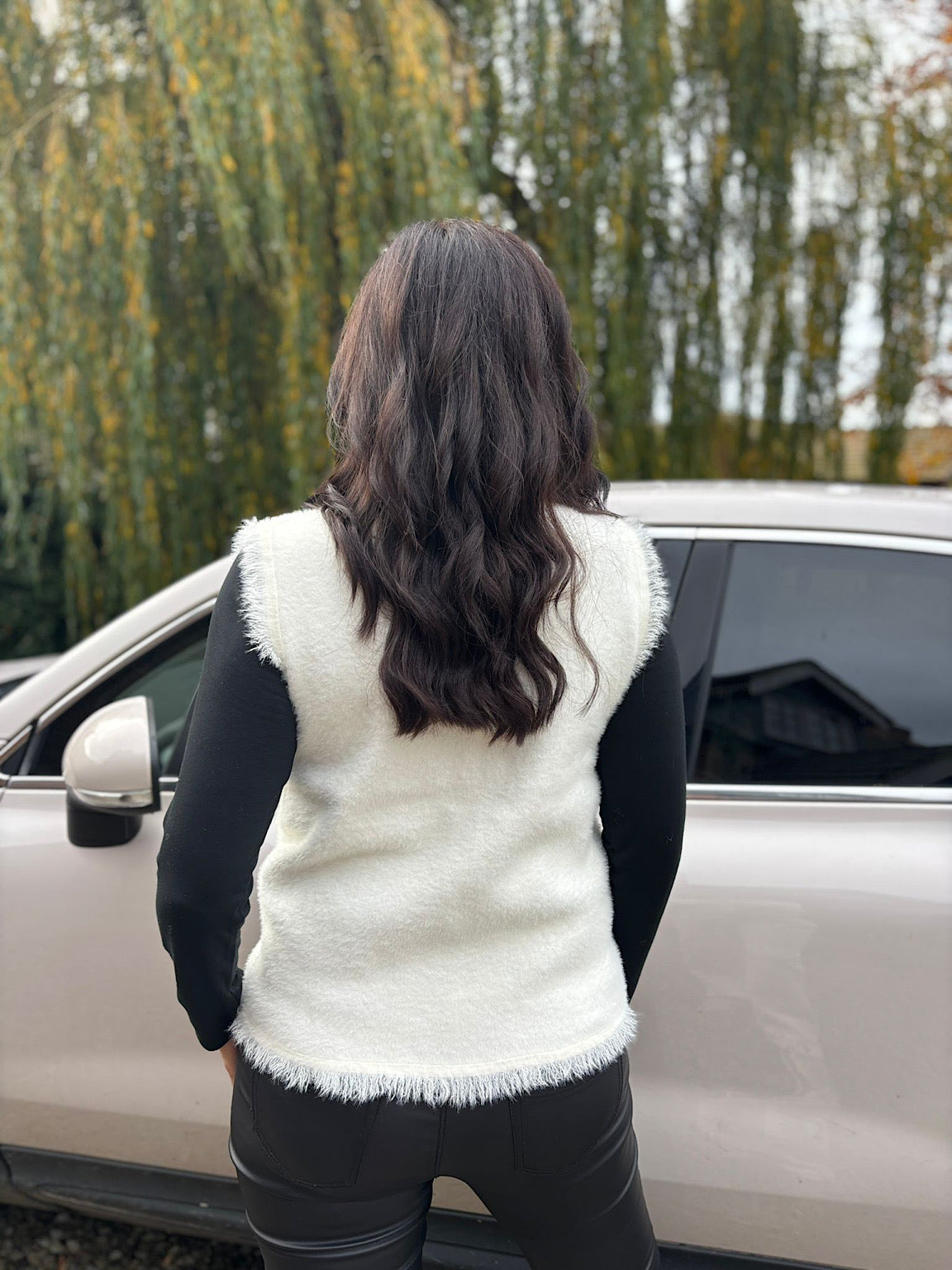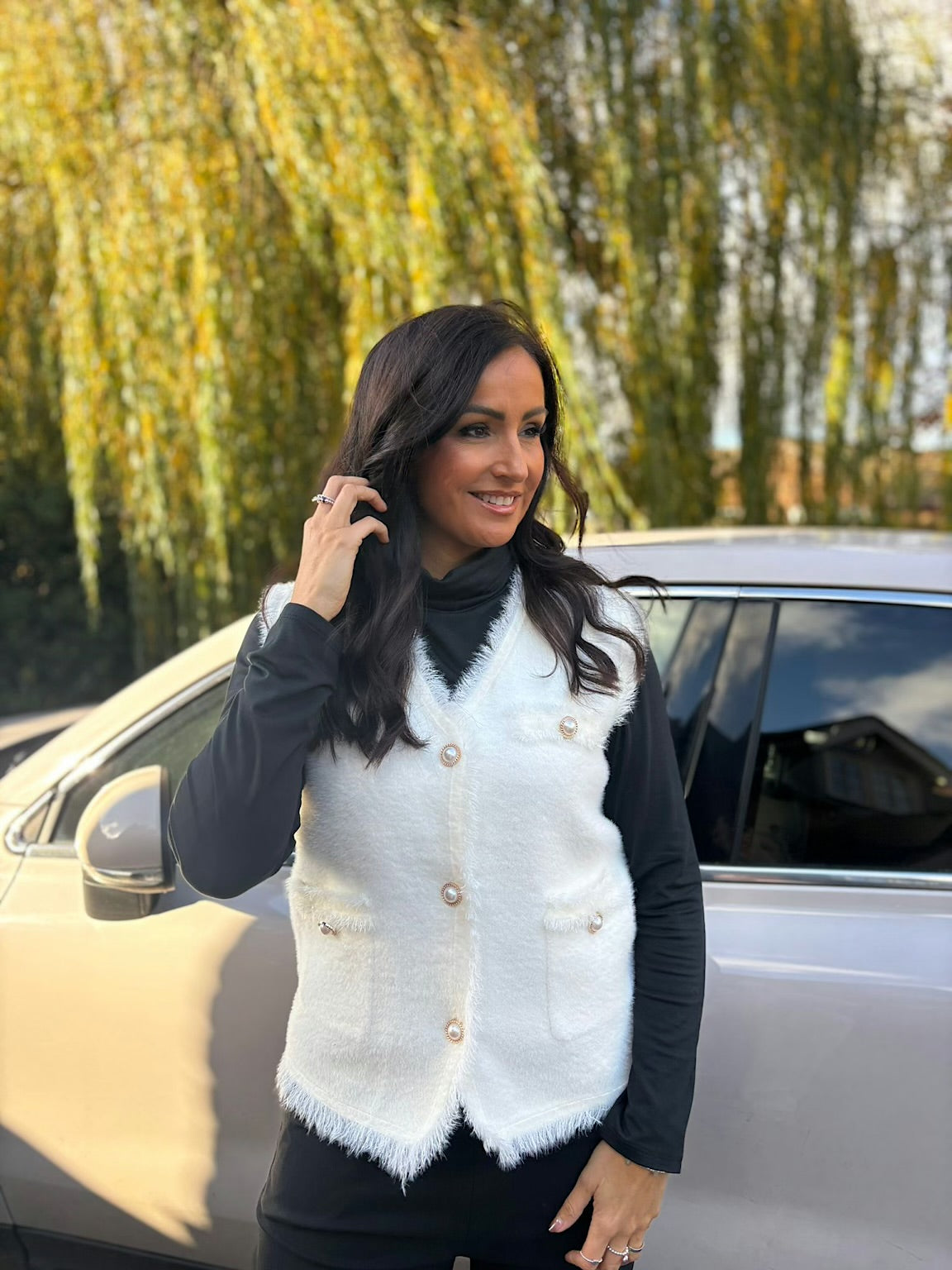 Soft Fringed Waistcoat Selma Crafted from premium thick fabric that feels wonderfully soft against the skin, this waistcoat brings effortless elegance to your wardrobe. Delicate fringing traces the edges, creating beautiful movement and visual interest with every wear. Distinctive pearl buttons finished with a gold rim add a touch of refined sophistication. Perfect for layering over dresses or pairing with tailored trousers, Selma is your go-to piece for adding texture and charm to any outfit.