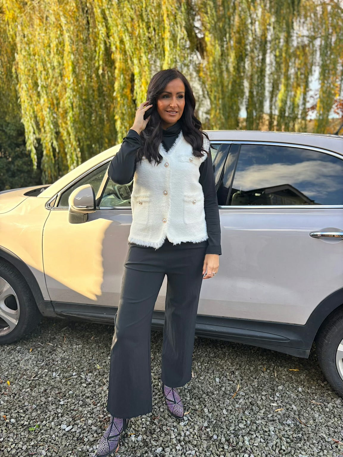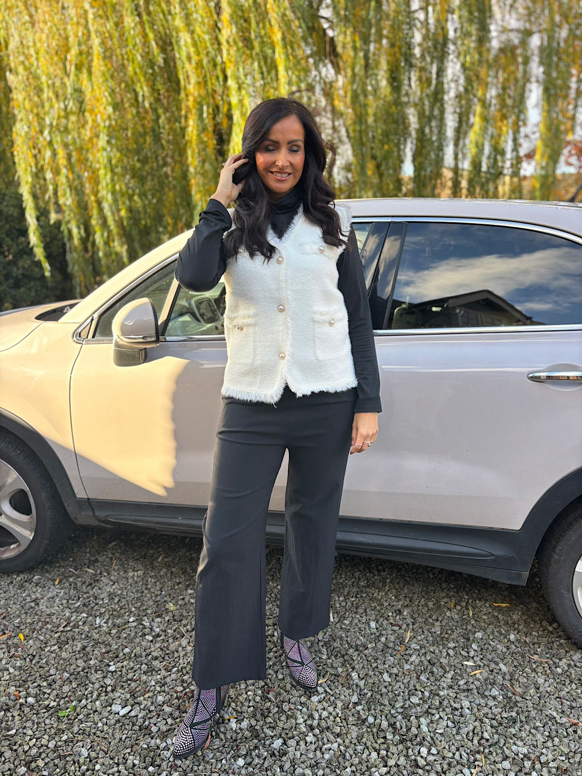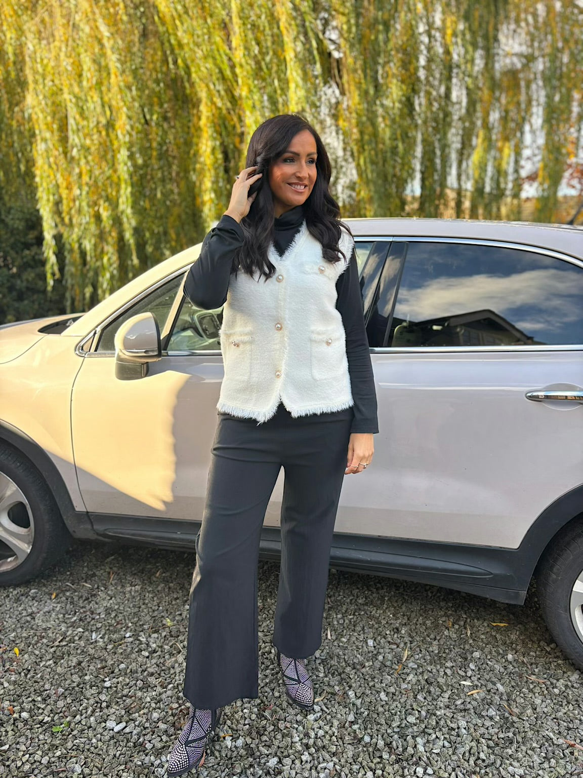 Soft Fringed Waistcoat Selma Crafted from premium thick fabric that feels wonderfully soft against the skin, this waistcoat brings effortless elegance to your wardrobe. Delicate fringing traces the edges, creating beautiful movement and visual interest with every wear. Distinctive pearl buttons finished with a gold rim add a touch of refined sophistication. Perfect for layering over dresses or pairing with tailored trousers, Selma is your go-to piece for adding texture and charm to any outfit.