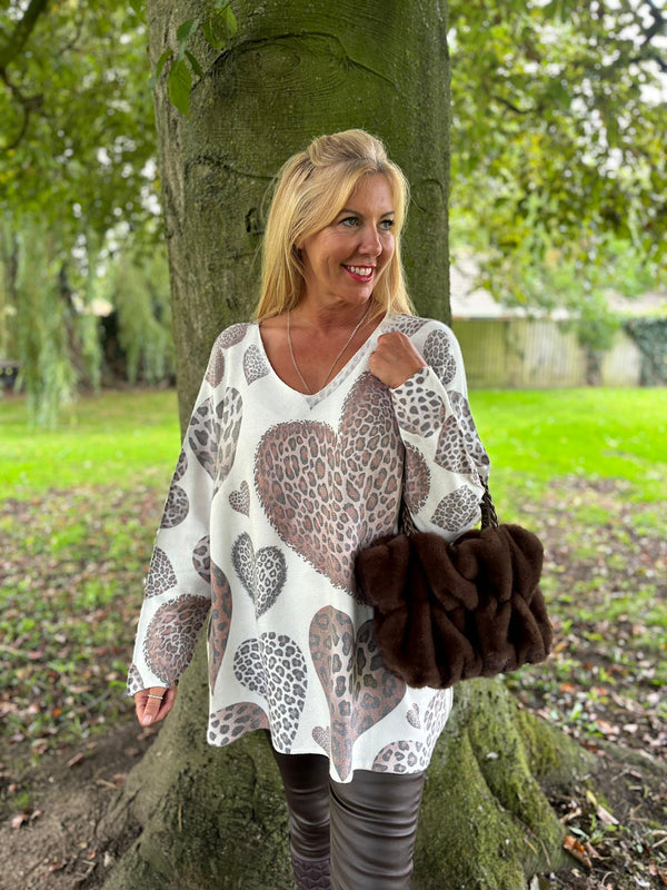 Experience refined comfort with our Winter White Soft Touch Animal Heart Knit from the Ava range. This elegant piece features a playful heart pattern expertly combined with a leopard print design, adding a unique and sophisticated touch to your winter wardrobe. Designed for softness and style, it offers cosy warmth while making a chic statement. Perfect for those who appreciate understated luxury with a hint of daring flair.