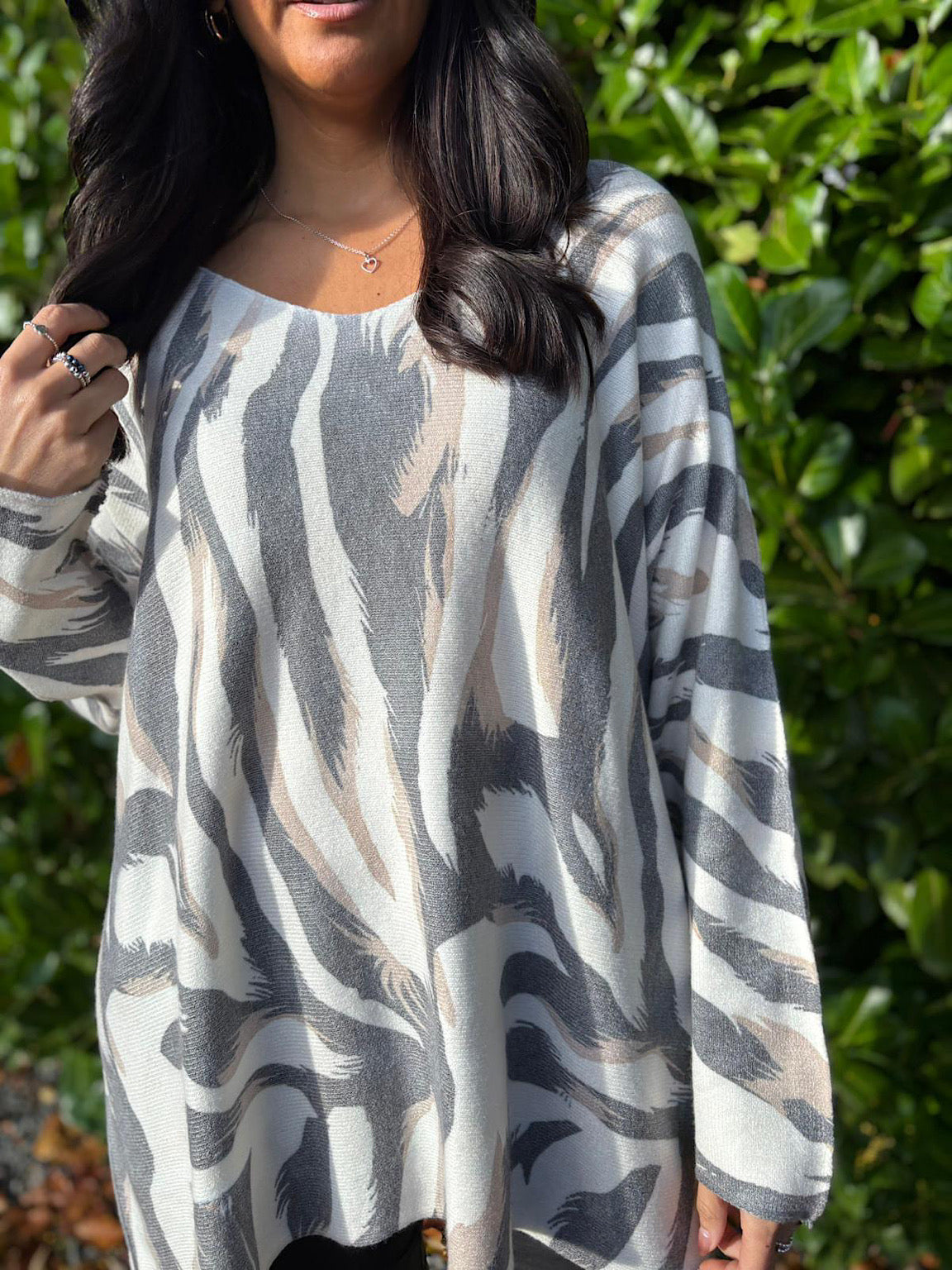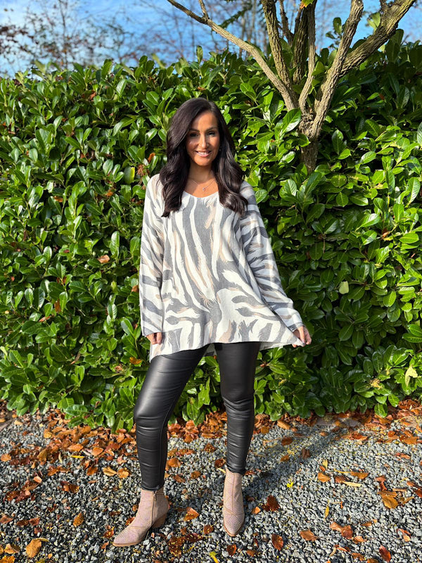 Elevate your wardrobe with this soft touch knit top featuring a subtle tiger print. Designed with a flattering V-neckline and long sleeves, it offers both comfort and style. The fine knit fabric provides a gentle, luxurious feel against the skin, making it perfect for sophisticated layering or standalone wear. Ideal for adding a refined edge to any outfit, this top balances modern design with timeless elegance.
