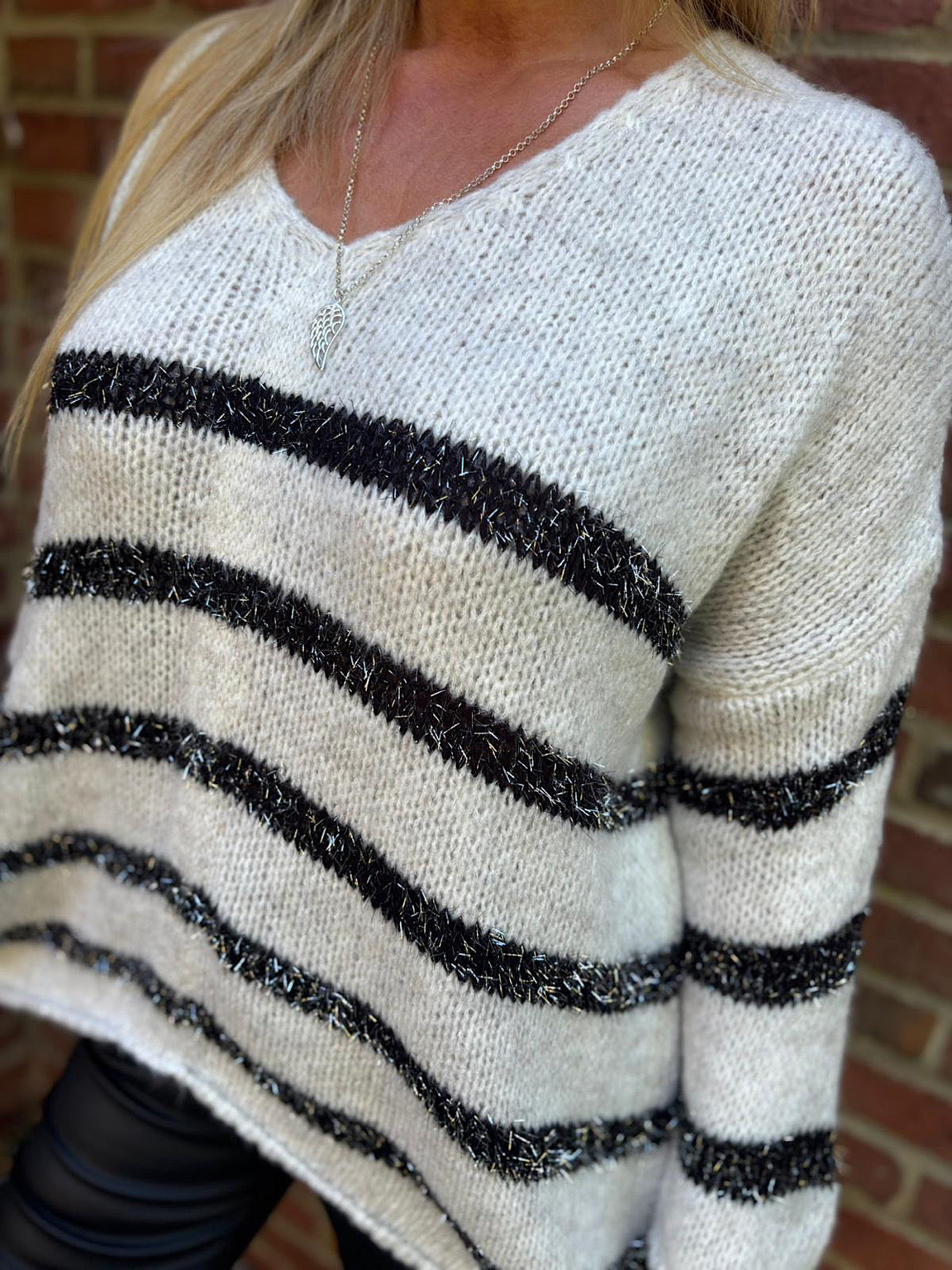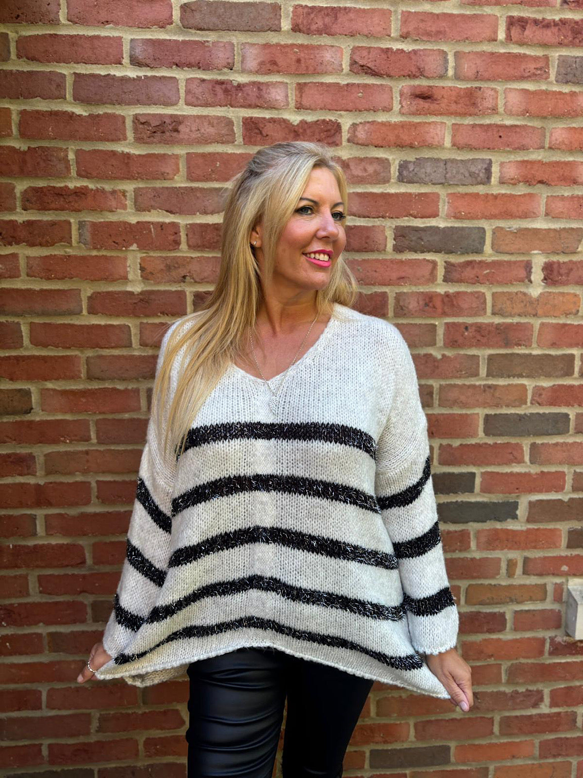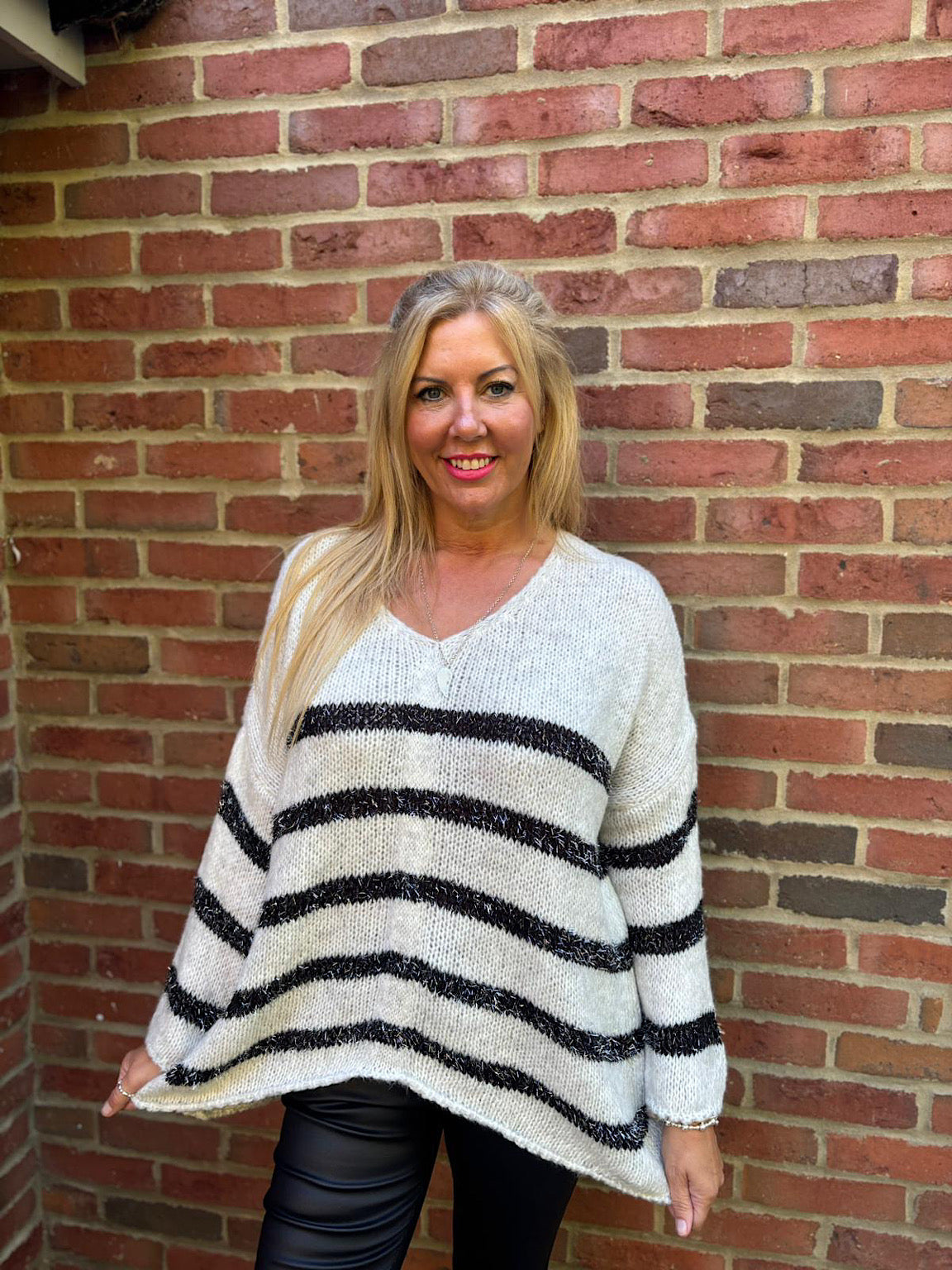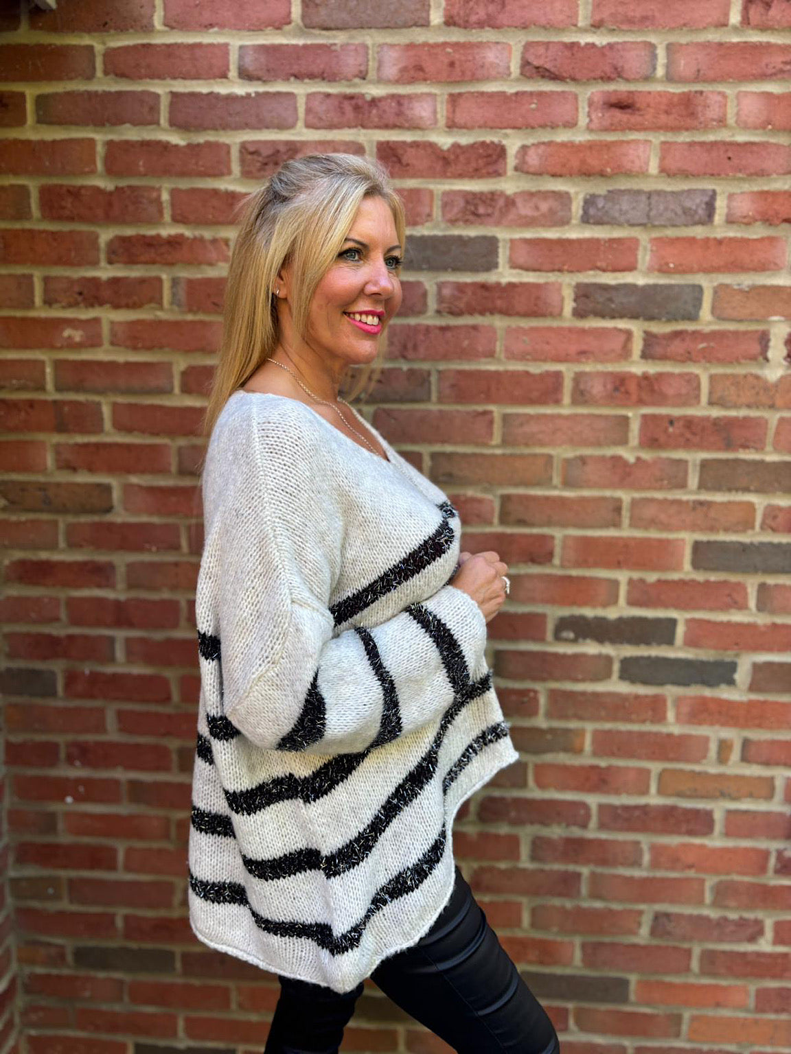 This Sparkle Stripe Knit Piper combines warmth and style with its cosy wool blend fabric. The oversized fit offers a relaxed, comfortable feel, while the subtle silver lurex stripes add a touch of sparkle to elevate your everyday look. Perfect for layering, this knit is both practical and effortlessly chic.