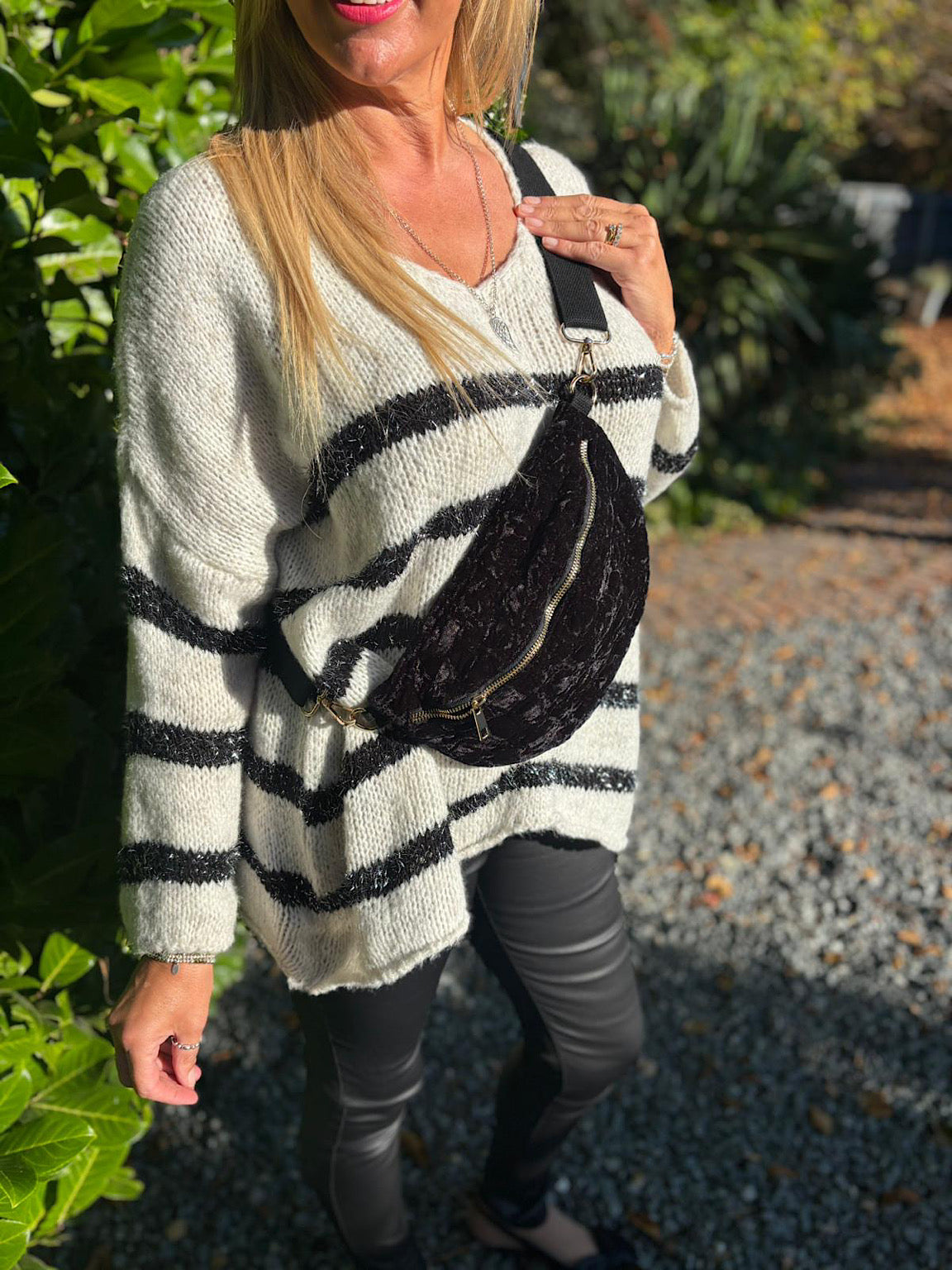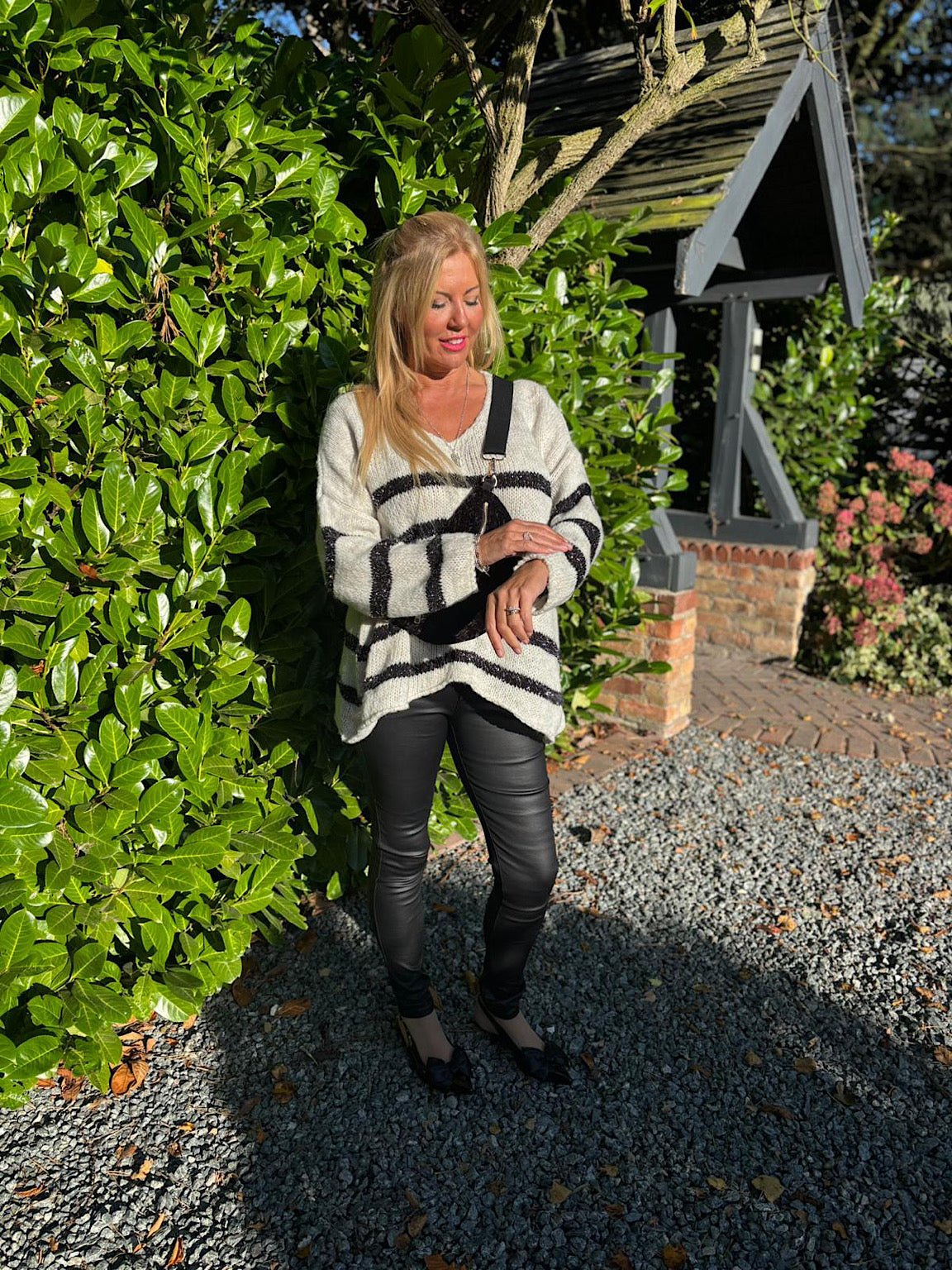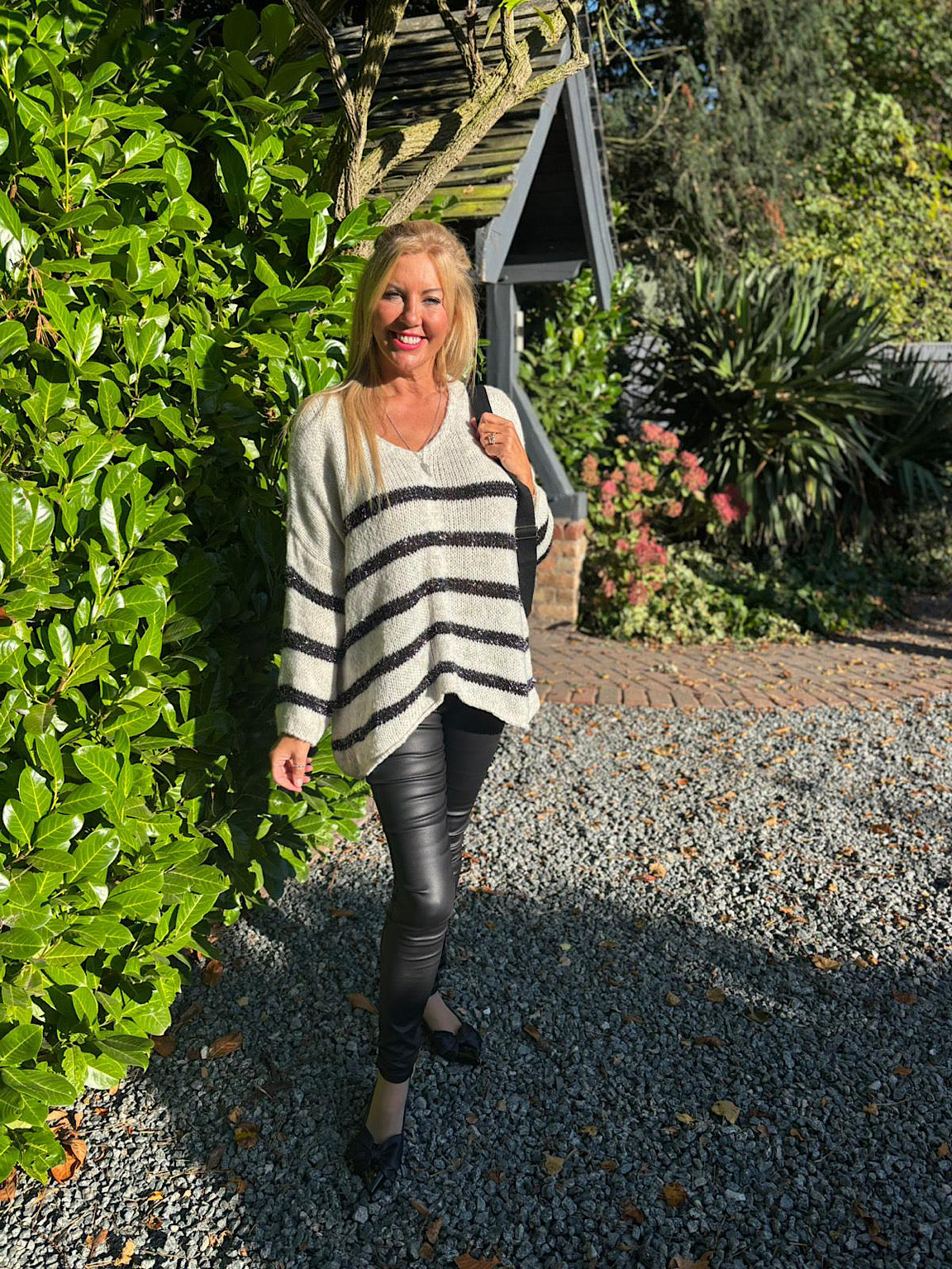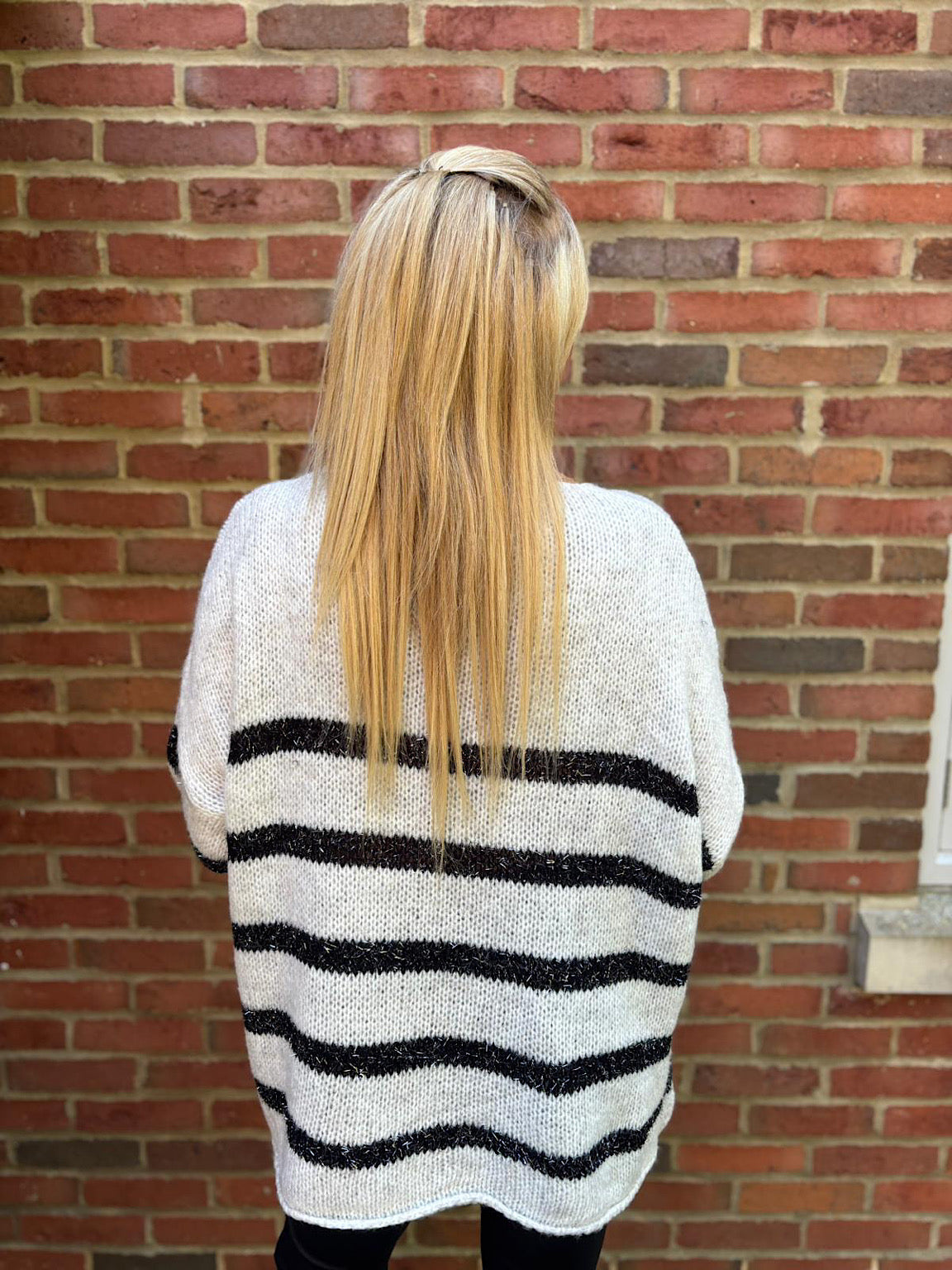 This Sparkle Stripe Knit Piper combines warmth and style with its cosy wool blend fabric. The oversized fit offers a relaxed, comfortable feel, while the subtle silver lurex stripes add a touch of sparkle to elevate your everyday look. Perfect for layering, this knit is both practical and effortlessly chic.