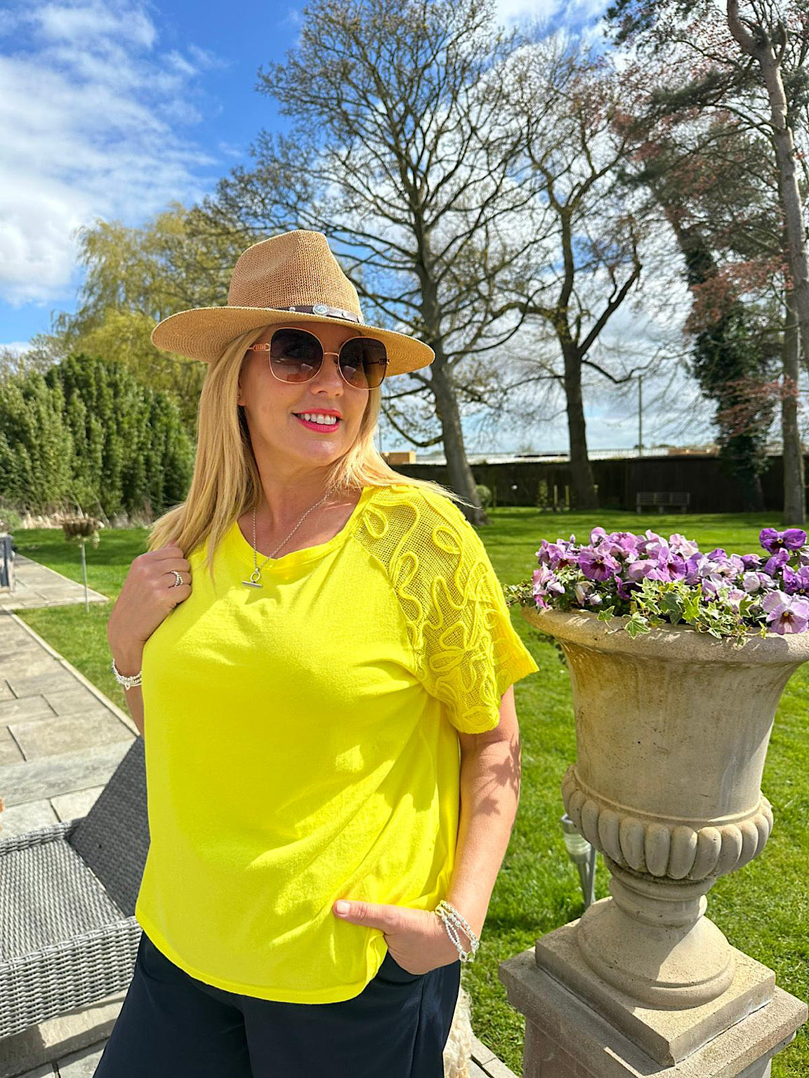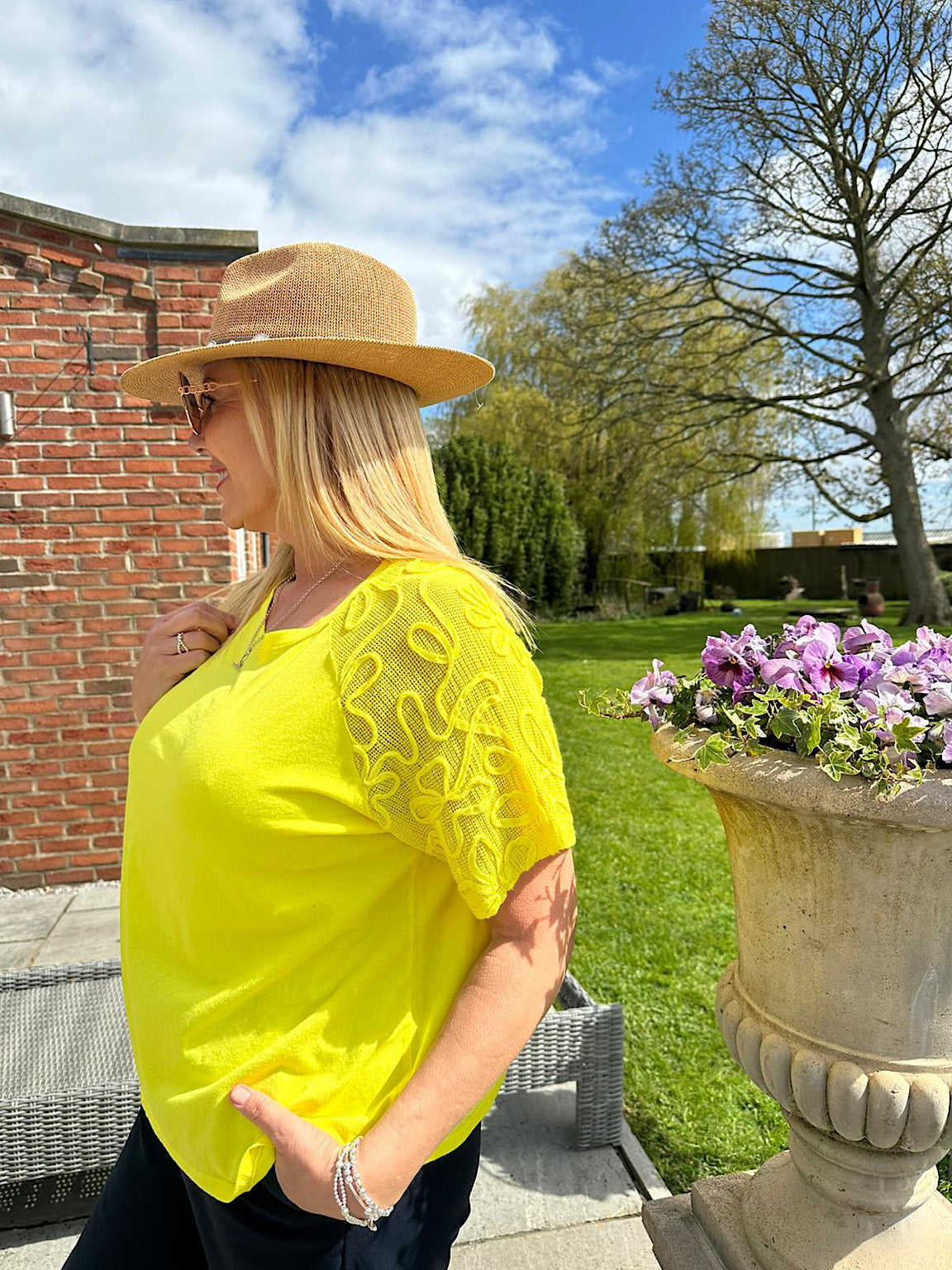 Soft cotton-blend tee elevated with delicate net sleeves featuring an applique floral design. The textured sleeves add visual interest and dimension to this versatile basic, perfect for layering or wearing solo. Comfortable everyday wear with a touch of feminine detail.